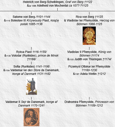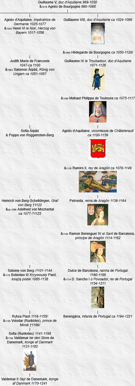 Valdemar II Sejr, konge af Danmark1170-1241 & Helena Guttormsdotter Autaumsson 1167- &1200 Ingebiorg Welf 1174-/1204 &1205 Drahomira, Prinzessin von Böhmen?1189-1212 &1214 Berengária, infanta de Portugalca 1194-1221 1. Knud Valdemarsen 1211-1260 & Hedwig von Pomerellen 1.1. Svantepolk Knutsson ca 1230-1310 &ca 1250 Benedikta Sunesdotter Folkungaätten †ca 1261 1.1.1. Ingeborg Svantepolksdotter †/1341 &1280/ Tune Anundsson Ving-ätten †1293/ & Johan Filipsson Aspenäs-ätten †1280 1.1.1.1. Anund Tunesson Ving-ätten †1334/ 1.1.1.2. Knut Johansson Aspenäs-ätten †1346 1.1.1.3. Birgitta Johansdotter Aspenäs-ätten †1328/1346 1.1.2. Ingrid Svantepolksdotter †1350/ &1288 Folke Algotsson †/1310 1.1.2.1. Knut Folkesson ca 1290-1348/1349 1.2. Erik Knudsen Skarsholm †1304 & Elisabeth af Halland 1.2.1. Barnim Skarsholm †/1329 & Ne Pedersdatter 1.2.1.1. Erik Barnumsen Skarsholm †/1369 2. Valdemar, prins af Danmark1209-1231 & Ne N &1229 Leonor de Portugal 1211-1231 2.1. Sofie, prinsesse af Danmark†1241 &ca 1240 Henri-Burwin III, prince de Rostockca 1218-1278 2.1.1. Waldemar von Mecklenburg ca 1241-1282 &ca 1272 Agnes von Holstein-Schauenburg ca 1250-ca 1287 2.1.1.1. Nicolas von Mecklenburg ca 1273-1314 2.1.2. Jean von Mecklenburg 2.2. Ne de Danemark 1231-1231 3. Erik IV Plovpenning, konge af Danmark1216-1250 &1239 Jutta von Sachsen ca 1223-?1250 3.1. Ingeburge, prinsesse af Danmark1244-1287 &1261 Magnus VI Yngling, kong av Norge1238-1280 3.1.1. Erik II, kong av Norge1268-1299 &1281 Margaret of Scotland 1261-1283 &1293 Isobel Bruce 1275-1358 3.1.1.1. Margareta Yngling 1283-1290 3.1.1.2. Ingeburge Yngling 1297-ca 1356 3.1.2. Haakon V, kong av Norge1270-1319 &1299 Euphemia von Rügen ca 1280-1312 & Ne N 3.1.2.1. Ingeburge, prinsesse av Norge1301-1361 3.1.2.2. Agnes Yngling 1292-1319 3.2. Sophie, prinsesse af Danmark†1286 &1260 Valdemar Folkungaätten, konung av Sverige1237-1302 3.2.1. Ingeborg Folkungaätten, prinsessa av Sverigeca 1260-?1290 &1275 Gerhard II, Graf von Holstein-Plön1253-1312 3.2.1.1. Gerhard IV, Graf von Holstein-Segebergca 1276-1323 3.2.1.2. Elisabeth von Holstein-Plön †1318/1319 3.2.2. Rikissa Folkungaätten, prinsessa av Sverige†1288..1293 &1285 Przemysł II Piast, król polski1257-1296 3.2.2.1. Ryksa Piast 1288-1335 4. Sophie, prinsesse af Danmark1217-1247 &?1236 Johann I, Markgraf von Brandenburgca 1213-1266/1267 4.1. Johann II, Markgraf von Brandenburg†1281 4.2. Otto IV mit dem Pfeil, Markgraf von Brandenburg†1308 4.3. Konrad II, Markgraf von Brandenburg1240-1304 &1260 Konstancja Piast 1245/1246-1281 4.3.1. Johann IV, Markgraf von Brandenburg1261-1305 4.3.2. Otto VII, Markgraf von Brandenburg1262-1297/1298 4.3.3. Waldemar, Markgraf von Brandenburg†1319 4.3.4. Agnes von Brandenburg ca 1275-1329 &1300 Albrecht I, Fürst von Anhalt-Zerbstca 1260-1316 4.3.4.1. Albrecht II, Fürst von Anhalt-Zerbstca 1300-1362 4.3.4.2. Agnes von Anhalt-Zerbst †1352 4.3.4.3. Mathilda von Anhalt-Zerbst ca 1310-1354/ 4.4. Helene von Brandenburg 1241/1242-1303/1304 & Dietrich IV, Markgraf von Landsberg1242-1285 4.4.1. Sophie Wettin ca 1260-1318 & Konrad I Piast, Herzog von Glogau1228-1274 4.5. Erich von Brandenburg †1295 5. Abel, konge af Danmarkca 1218-1252 &1237 Mathilde, Gräfin von Holstein1225-1287 5.1. Valdemar III, Herzog von Schleswig†1257 5.2. Erik I, Herzog von Schleswigca 1240-1272 & Margareta von Rügen †1272 5.2.1. Valdemar IV, Herzog von Schleswig†1312 &1287 Elisabeth von Sachsen-Lauenburg †/1306 & Ne N 5.2.1.1. Erik II, Herzog von Schleswig†1325 5.2.2. Éric, duc de Langeland1272-1310 5.3. Sofia, prinsesse af Danmarkca 1240-1284/ &1258 Bernhard I, Fürst von Anhalt-Bernburg†1286/1287 5.3.1. Bernhard II, Fürst von Anhalt-Bernburgca 1260-1324 &ca 1290 Helena von Rügen ca 1270-1315 5.3.1.1. Bernhard III, Fürst von Anhalt-Bernburgca 1300-1348 5.3.2. Sofia, Prinzessin von Anhalt-Bernburgca 1260-1330 & Dietrich II, Graf von Honstein zu Klettenberg/1254-1309 5.3.2.1. Heinrich IV, Graf von Honstein zu Klettenberg†/1344 5.3.2.2. Dietrich III, Graf von Honstein zu Hohenstein†1329..1330 5.3.2.3. Sophia von Honstein 5.4. Abel de Danemark 1252-1279 6. Christoffer Ier, konge af Danmarkca 1219-1259 &1248 Margrethe Sambiria von Pomerellen 1230..1234-1282 6.1. Erik V Klipping, konge af Danmarkca 1249-1286 &1273 Agnes von Brandenburg 1257-1304 6.1.1. Erik VI Menved, konge af Danmark1274-1319 &1296 Ingeborg Folkungaätten, prinsessa av Sverigeca 1277-1319 6.1.2. Richiza, prinsesse af Danmarkca 1275- &1292 Nikolaus II, Fürst von Werleca 1270-1316 6.1.2.1. Johann III, Fürst von Werle†1352/ 6.1.2.2. Sophia von Werle 1298-1339/ 6.1.3. Christoffer II, konge af Danmark1276-1332 & Euphemia von Pommern ca 1290-1330 &ca 1300 Inger Mette Lunge 6.1.3.1. Margrete, prinsesse af Danmarkca 1305-1340 6.1.3.2. Erik de Danemark 1307-1331 6.1.3.3. Otton de Danemark, duc de Laaland†1347/ 6.1.3.4. Valdemar IV Atterdag, konge af Danmarkca 1320-1375 6.1.3.5. Erik Christoffersen Løvenbalk 6.1.3.6. Regitze Christoffersdatter Løvenbalk †1365/ 6.1.4. Margrethe, prinsesse af Danmark†1341 &1298 Birger Magnusson Folkungaätten, konung av Sverige1280-1321 6.1.4.1. Magnus Folkungaätten, prins av Sverige1300-1320 6.2. Margrete, prinsesse af Danmark1250-1306 & Johann II von Holstein-Schauenburg, Graf von Holstein-Kielca 1253-?1321 6.3. Mechtild, prinsesse af Danmark†1311 & Albrecht III, Markgraf von Brandenburgca 1250-1300 6.3.1. Otto von Brandenburg †1299/1300 6.3.2. Beatrix von Brandenburg †1314 & Heinrich II der Löwe, Herzog von Mecklenburg1267-1329 6.3.2.1. Mathilde von Mecklenburg ?1293-1350..1359 6.3.3. Margareta von Brandenburg 1270/-1315 &/1293 Przemysł II, król polski1257-1296 &1302 Albrecht von Sachsen-Ratzeburg