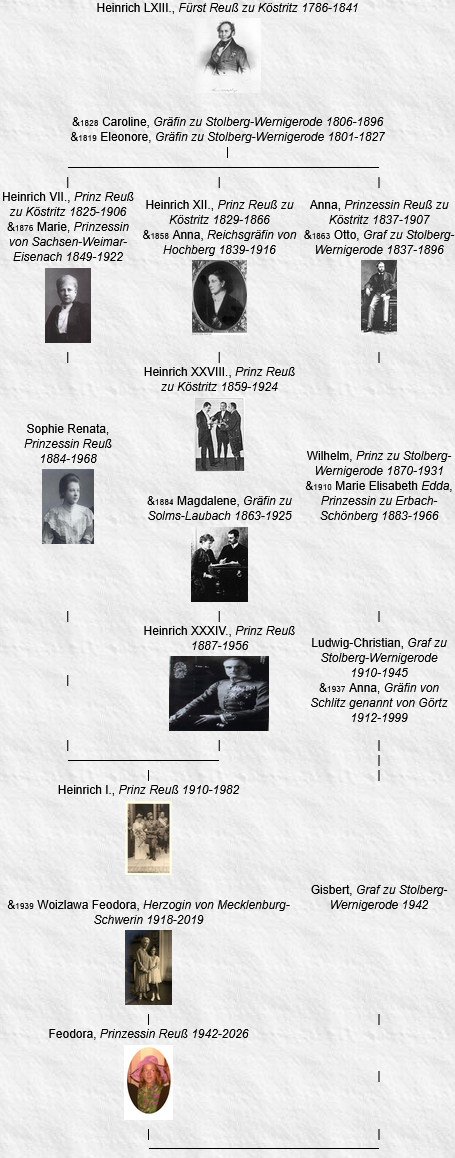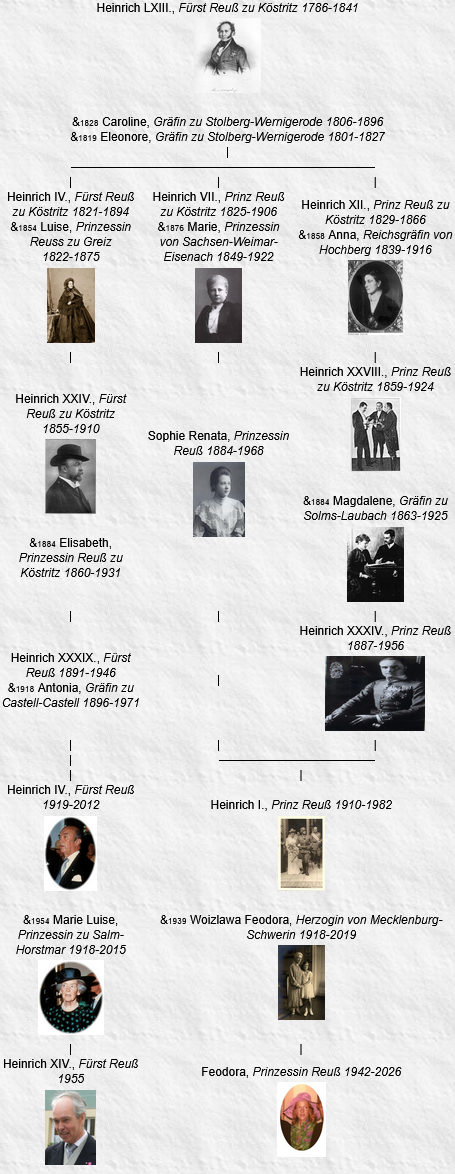 14 Heinrich XXVII., Fürst Reuß j.L., Graf von Plauen, Herr von Plauen, zu Greiz, zu Lobenstein, zu Schleiz, zu Gera et zu Kranichfeld, né le 10 novembre 1858, Gera, Thüringen (Deutschland), décédé le 21 novembre 1928, Gera, Thüringen (Deutschland) (à l’âge de 70 ans).