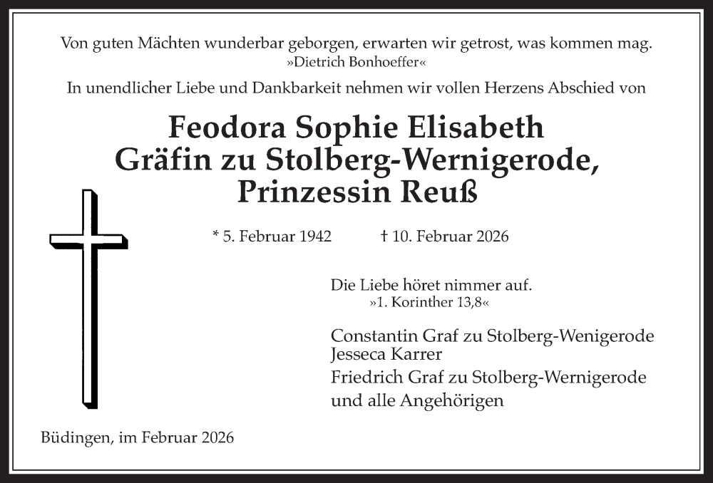 Feodora, Prinzessin Reuß, née le 5 février 1942, Gera, Thüringen (Deutschland), décédée le 10 février 2026, incinérée, Kloster Arnsburg (à l’âge de 84 ans).
