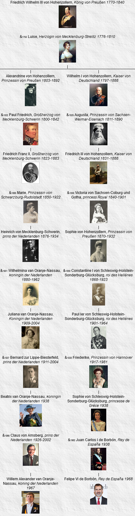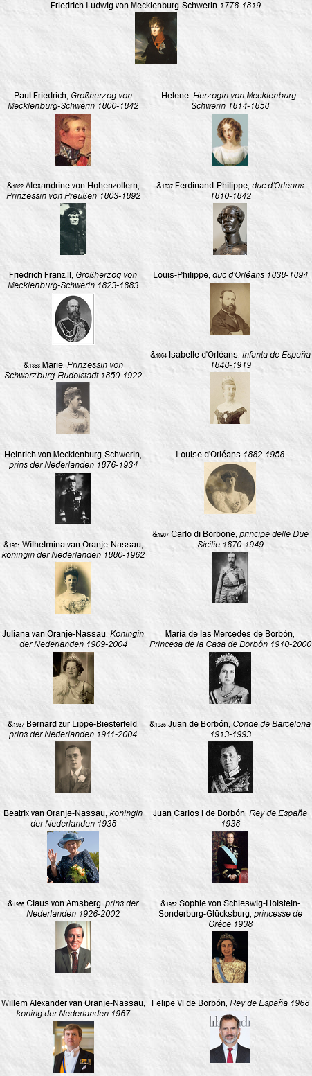 Le roi Guillaume-Alexandre Ier des Pays Bas : lien avec le roi d’Espagne Felipe, Príncipe de Asturias est doublement un cousin au 6e degré du futur roi Guillaume-Alexandre Ier des Pays Bas . 1. par la famille royale de Prusse 2. par la famille grand-ducale de Mecklembourg-Schwerin Partager : Cliquer pour partager sur X(ouvre dans une nouvelle fenêtre) X Cliquez pour partager sur Facebook(ouvre dans une nouvelle fenêtre) Facebook Cliquez pour partager sur Telegram(ouvre dans une nouvelle fenêtre) Telegram Cliquez pour partager sur WhatsApp(ouvre dans une nouvelle fenêtre) WhatsApp Cliquez pour partager sur Pocket(ouvre dans une nouvelle fenêtre) Pocket Cliquer pour envoyer un lien par e-mail à un ami(ouvre dans une nouvelle fenêtre) E-mail J’aime chargement… Articles similaires
