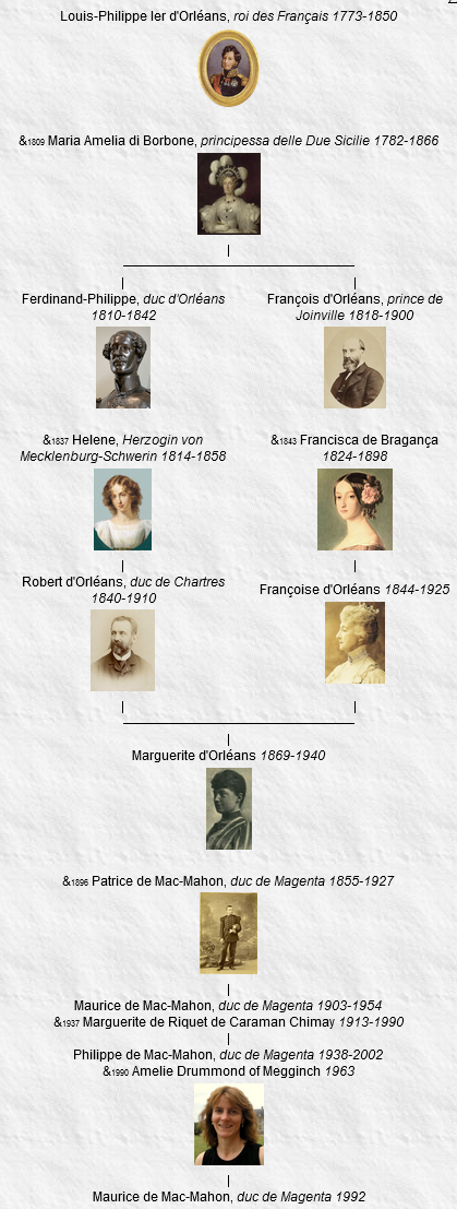 2 Philippe de Mac-Mahon, duc de Magenta (4e, 1954), marquis de Mac-Mahon (8e), né le 15 mai 1938, Paris XVI, décédé le 24 janvier 2002, Paris (à l’âge de 63 ans).