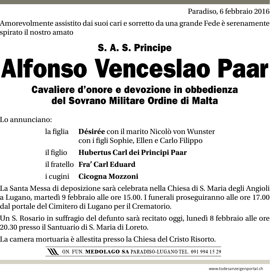 Alfons Wenzel Maria Wilhelm Victor Karl Pius, 7ème Fürst Paar est mort le 6 février à Lugano en Suisse.
