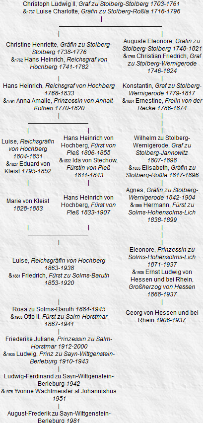 23 Luise, Reichsgräfin von Hochberg, Freiin zu Fürstenstein, née le 29 juin 1863, Pleß, décédée le 7 mai 1938, Klitschdorf (à l’âge de 74 ans).