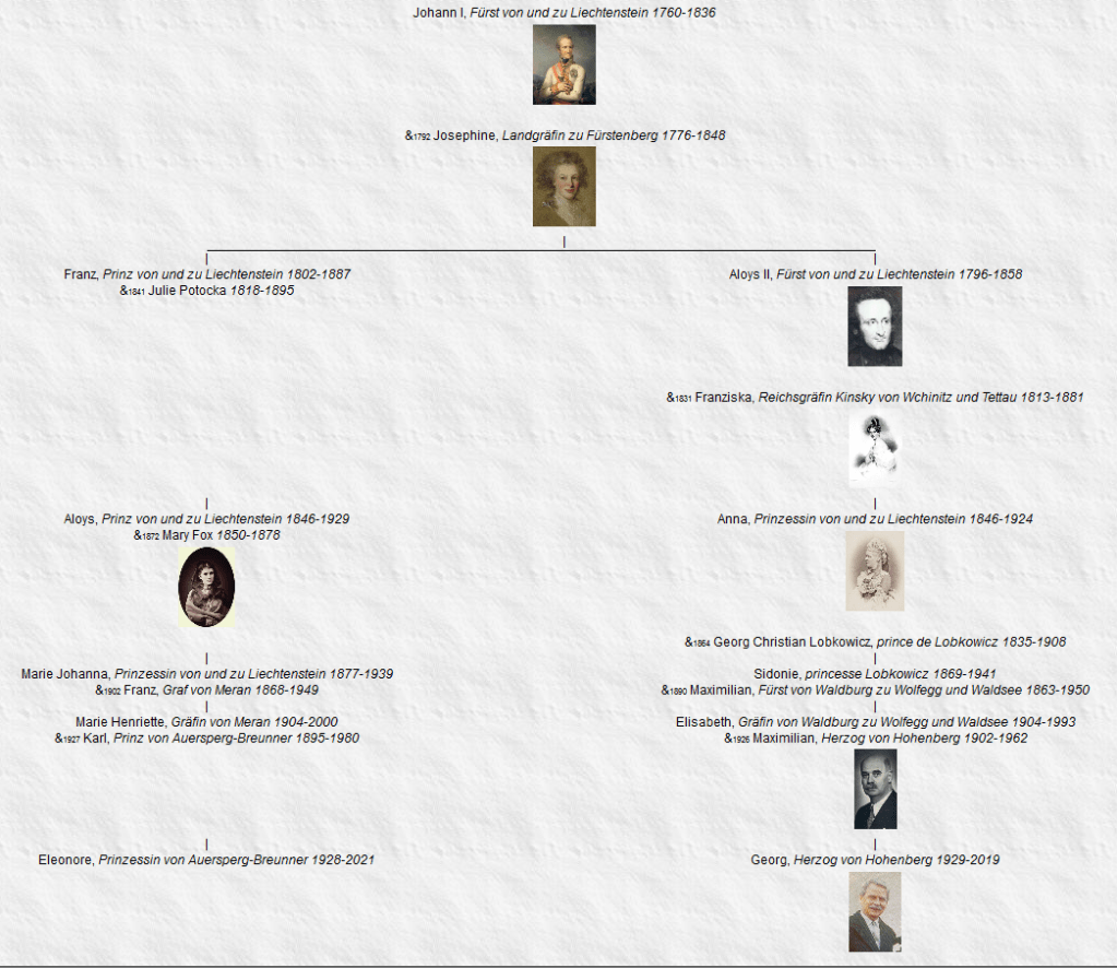 28 Franz, Prinz von und zu Liechtenstein, né le 25 février 1802, Wien, décédé le 31 mars 1887, Wien (à l’âge de 85 ans), général de cavalerie dans l’armée autrichienne, conseiller d’empire à vie.