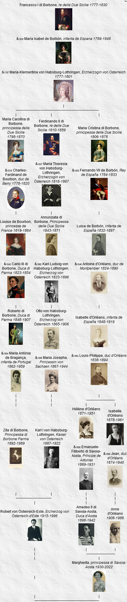 - Ferdinand-Philippe, né le 3 septembre 1810, Palermo, baptisé le 4 septembre 1810, chapelle royale, Palermo (Italia), décédé le 13 juillet 1842, Sablonville, Neuilly sur Seine, inhumé, chapelle royale Saint Louis, Dreux (Eure-et-Loir) (à l’âge de 31 ans). Voir 20.