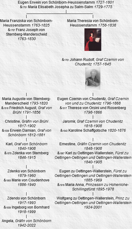 16 Erwein Damian, Graf von Schönborn, né le 17 mai 1812, Wien (Österreich), décédé le 12 janvier 1881, Prag (à l’âge de 68 ans), chambellan et conseiller d’empire héréditaire autrichien