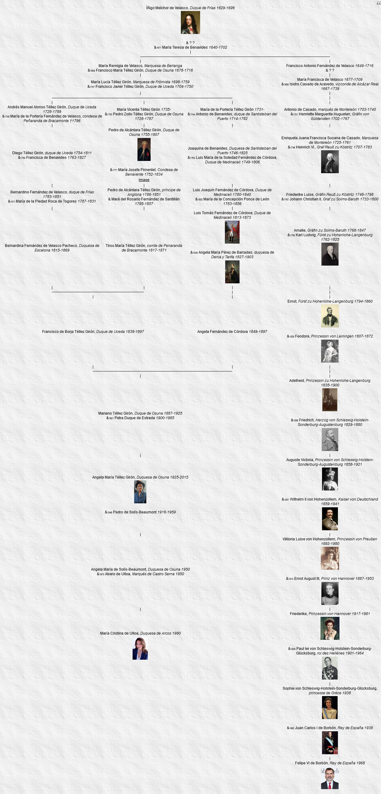7 Angela María Téllez Girón, Duquesa de Osuna, de Medina de Río Seco et de Arcos (16e), Duquesa de Gandía (19e), Duquesa de Uceda (16e), Condesa de Oropesa (20e), Marquesa de Jabalquinto (12e), Condesa de Peñaranda de Bracamonte et de Fuensalida, Condesa de Ureña (20e), Marquesa de Frechilla y Villarramiel, del Toral, de Llombay et de Frómista, Condesa de Pinto, de Alcaudete et de la Puebla de Montalbán, née le 7 février 1925, Málaga (España), décédée le 29 mai 2015, Sevilla (España) (à l’âge de 90 ans).