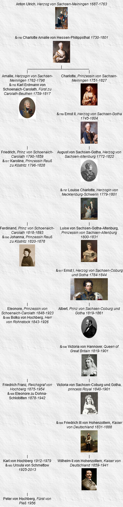 16 Hans Heinrich von Hochberg, Fürst von Pleß (1850), Reichsgraf von Hochberg, Freiherr zu Fürstenstein, né le 2 décembre 1806, Berlin, décédé le 20 décembre 1855, Berlin (à l’âge de 49 ans).
