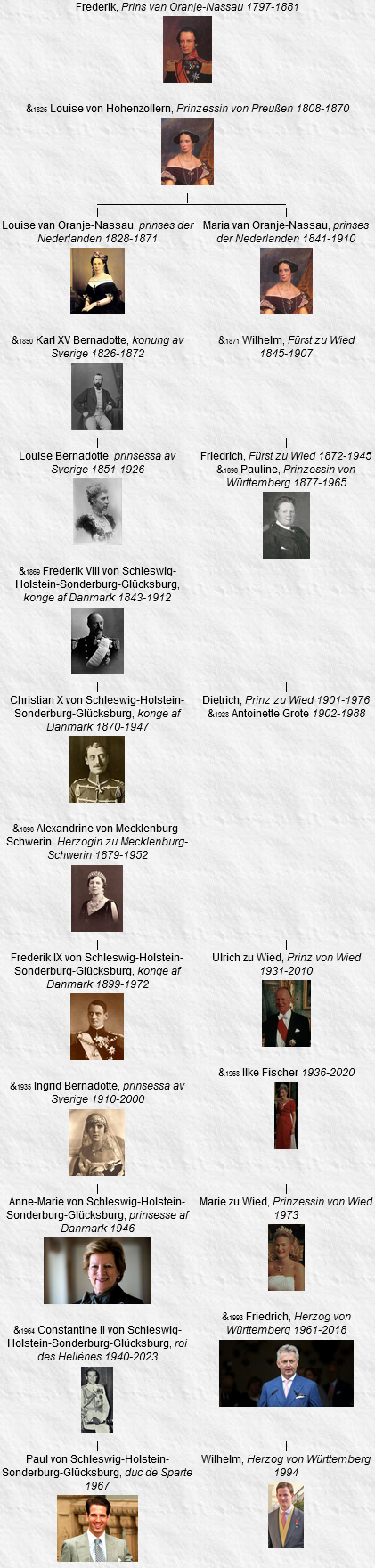 51 Louise, prinses der Nederlanden, née le 5 août 1828, La Haye (Pays-Bas), décédée le 30 mars 1871, Stockholm (Suède) (à l’âge de 42 ans).