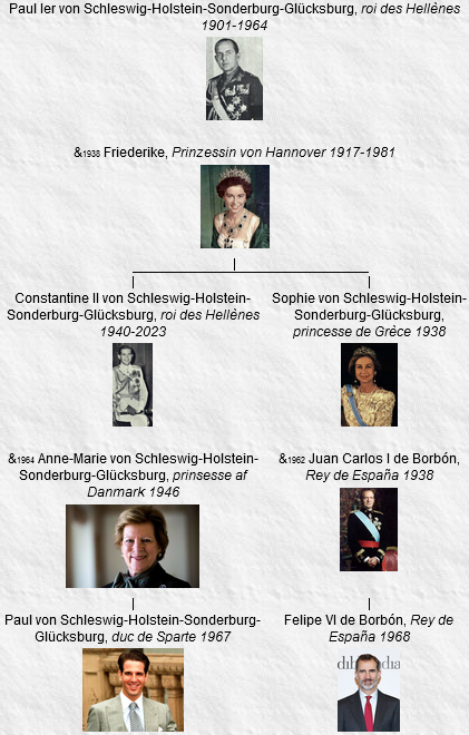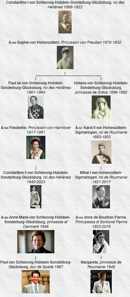 4 Paul Ier, roi des Hellènes (1947-1964), né le 14 décembre 1901, Tatoi (Grèce), décédé le 6 mars 1964, Tatoi (Grèce) (à l’âge de 62 ans).