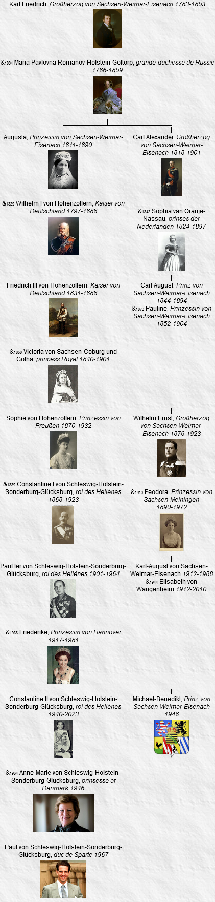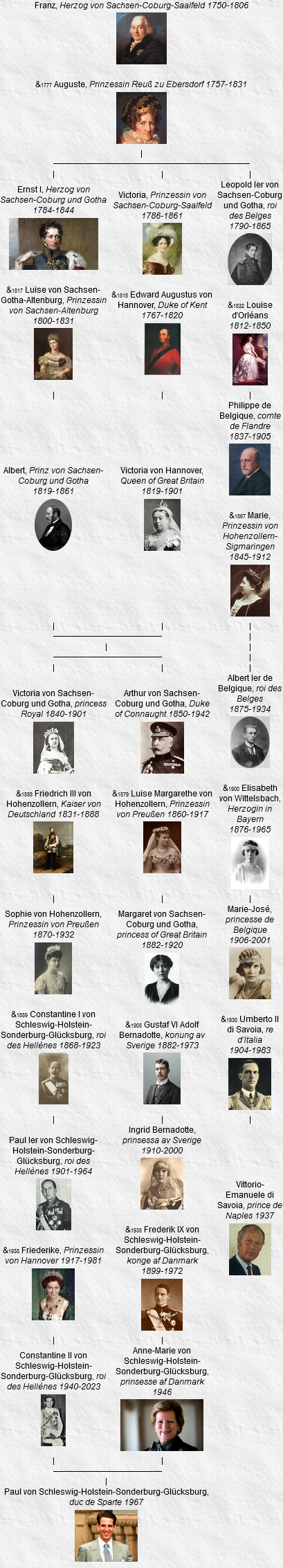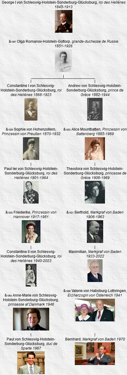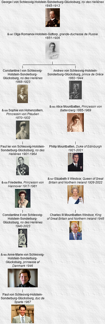 - George I, né le 24 décembre 1845, Copenhague (Danemark), assassiné le 18 mars 1913, Thessalonique (Grèce) (à l’âge de 67 ans). Voir 16.