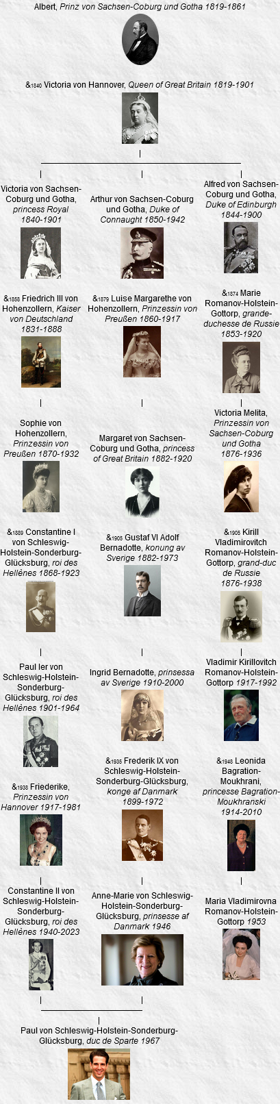 - Victoria, née le 21 novembre 1840, Buckingham, London (England), décédée le 5 août 1901, Friedrichshof (Deutschland), inhumée, Potsdam (D) (Friedenskirche) (à l’âge de 60 ans). Voir 19.