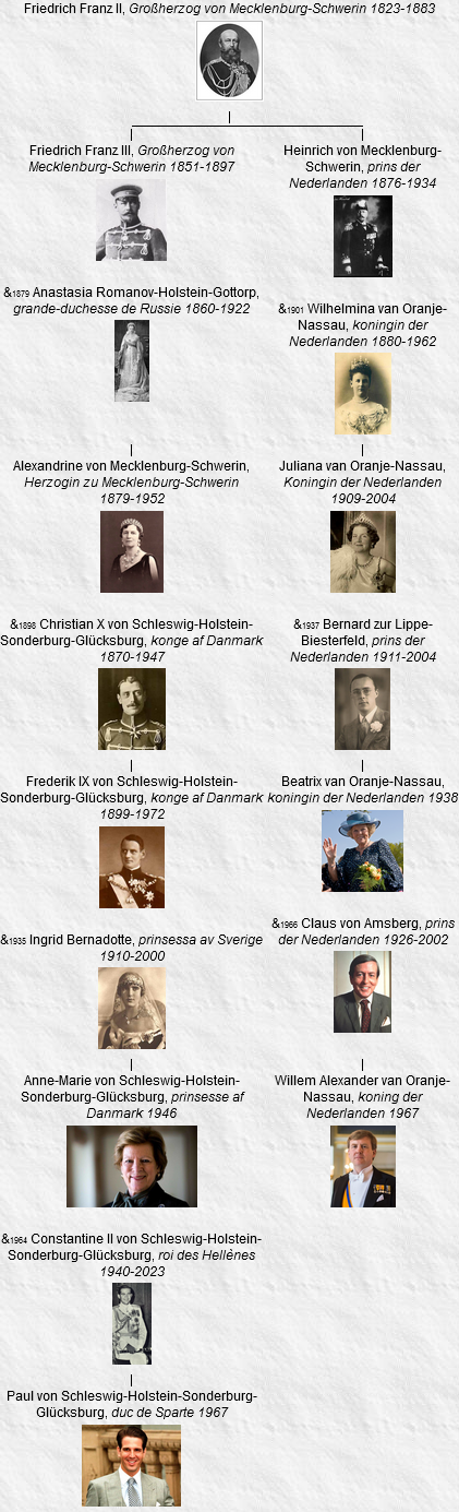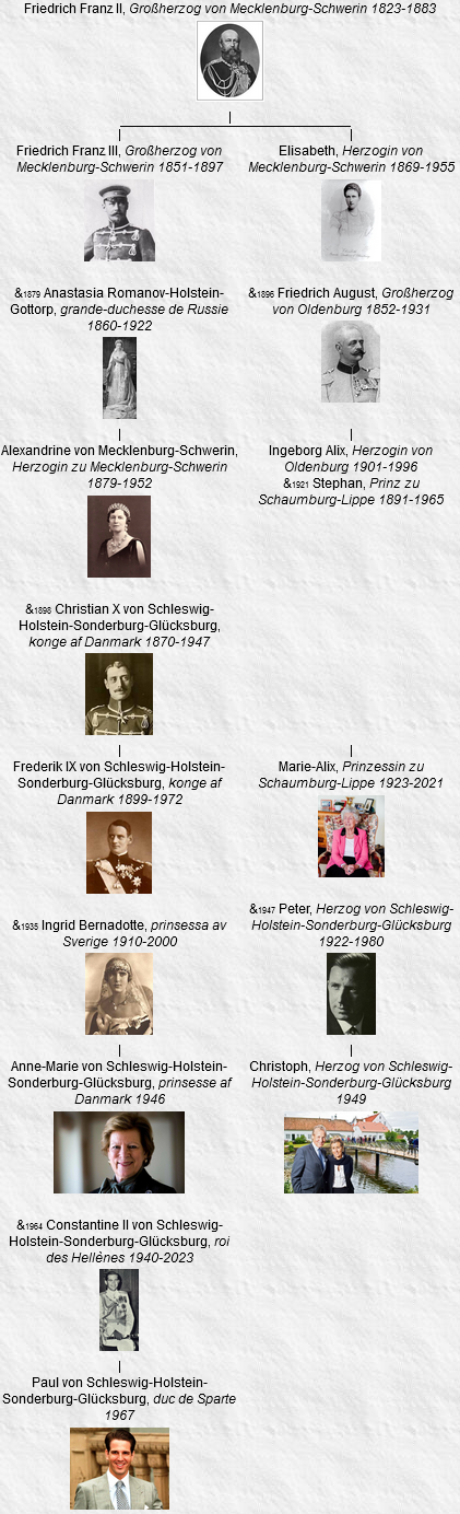 13 Alexandrine, Herzogin zu Mecklenburg-Schwerin, née le 24 décembre 1879, Schwerin, décédée le 28 décembre 1952, Copenhague (Danemark) (à l’âge de 73 ans).