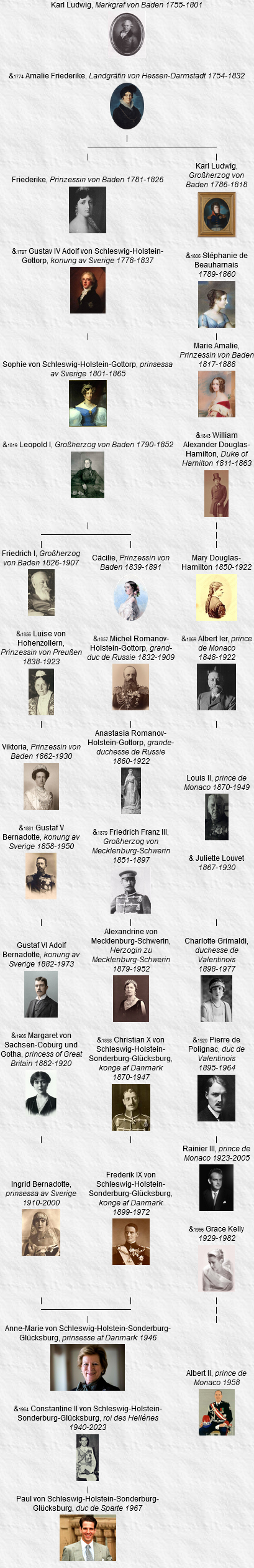 14 Gustaf VI Adolf, konung av Sverige (29 octobre 1950 – 15 septembre 1973), kronprins av Sverige (8 décembre 1907 – 29 octobre 1950), prins av Sverige, prins av Norge (11 novembre 1882 – 7 juin 1905), hertig av Skåne, né le 11 novembre 1882, Stockholm (Suède), décédé le 15 septembre 1973, Helsingborg, Skåne (Suède) (à l’âge de 90 ans).