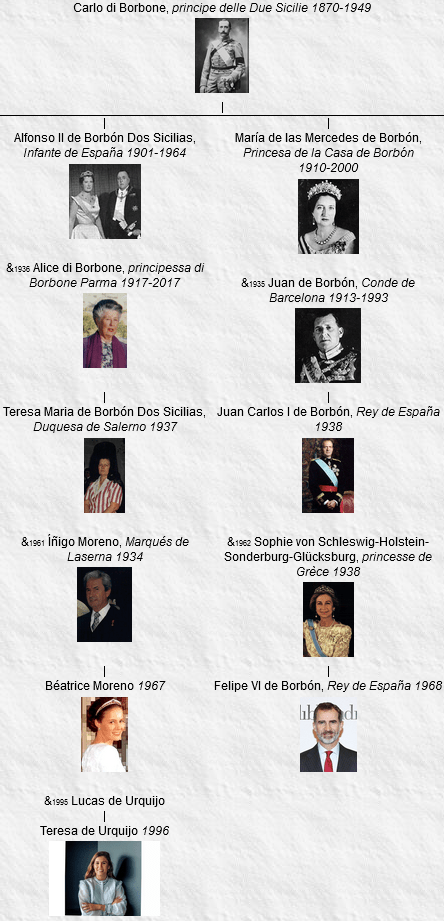 28 Carlo, principe delle Due Sicilie, infante de España (7 février 1901), né le 10 novembre 1870, Gries, décédé le 11 novembre 1949, Seville (à l’âge de 79 ans). Parents: 56 et 57.