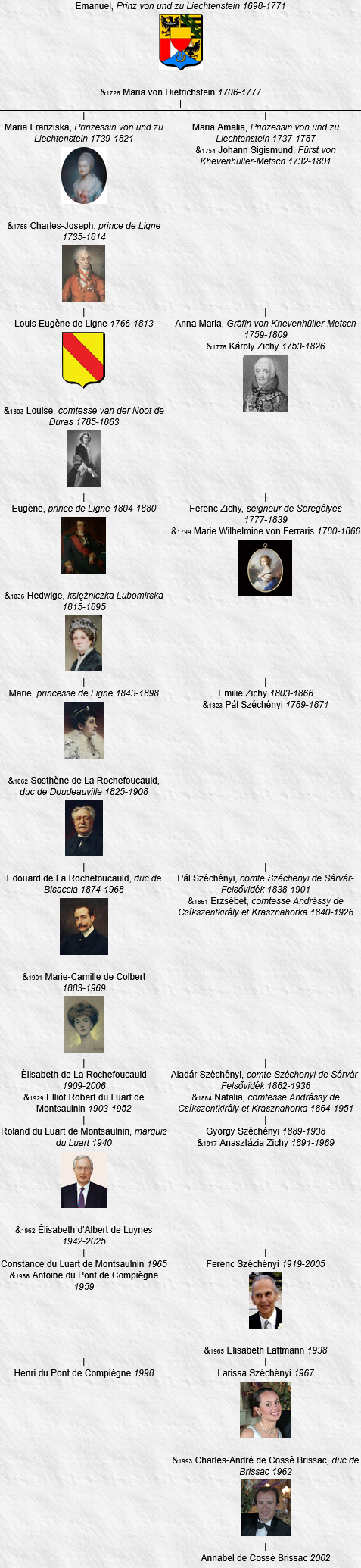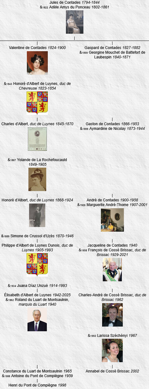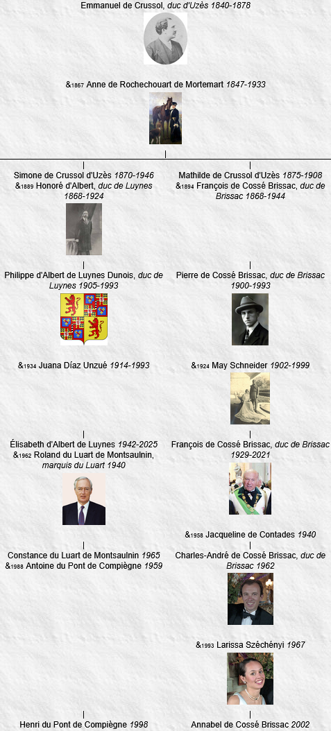 7 Élisabeth d’Albert de Luynes, née le 29 mai 1942, Buenos Aires (Argentine), décédée le 31 décembre 2025, Paris 8e, inhumée le 7 janvier 2026, Le Luart (Sarthe) (à l’âge de 83 ans).
