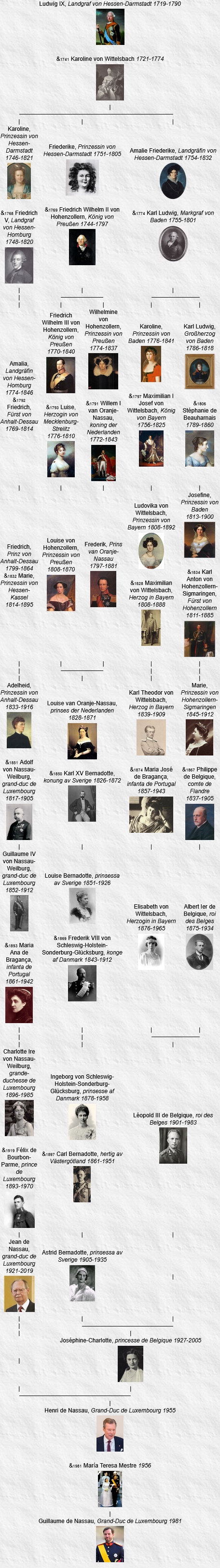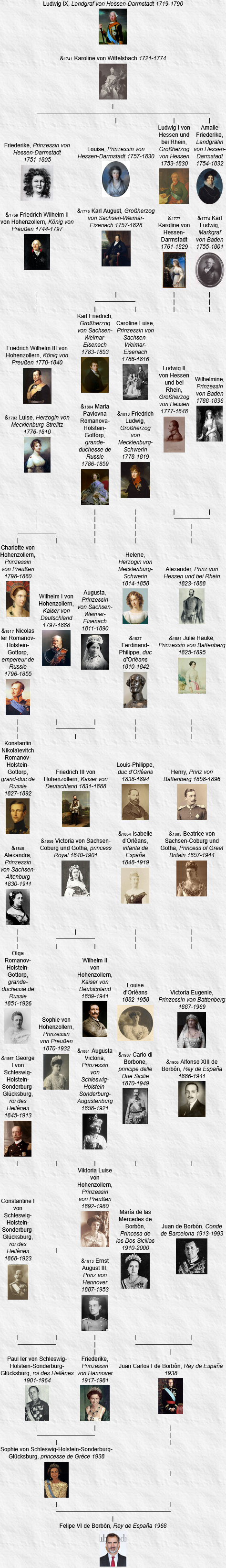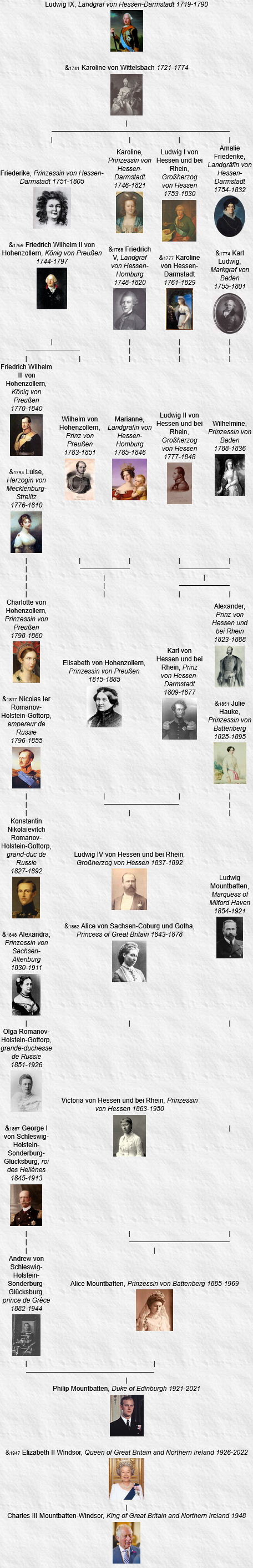 Louis IX de Hesse-Darmstadt et sa femme Caroline Henriette de Palatinat-Deux-Ponts-Birkenfeld sont devenus les ancêtres communs les plus récents de tous les monarques européens actuels le 8 septembre 2022 après le décès de la reine Élisabeth II, qui elle n’en descend pas, et l’accession au trône de son fils, Charles III, un descendant par son père.