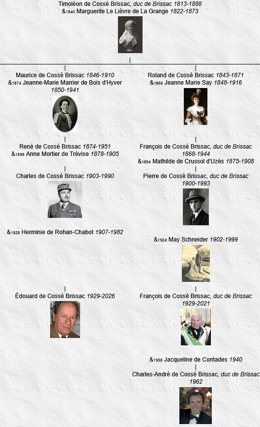32 Timoléon de Cossé Brissac, baron de Cossé-Brissac et de l’Empire (1er, 9 septembre 1810), comte de Cossé-Brissac et de l’Empire (1er, 20 février 1812), duc de Brissac (9e, 9 septembre 1792 – 7 avril 1848), né le 13 janvier 1775, Paris, baptisé le 13 janvier 1775, Saint Roch (Paris), décédé le 7 avril 1848, Paris (à l’âge de 73 ans), conseiller-Général de Maine-et-Loire (1802), préfet de Marengo (1809) puis de la Côte-d’Or.