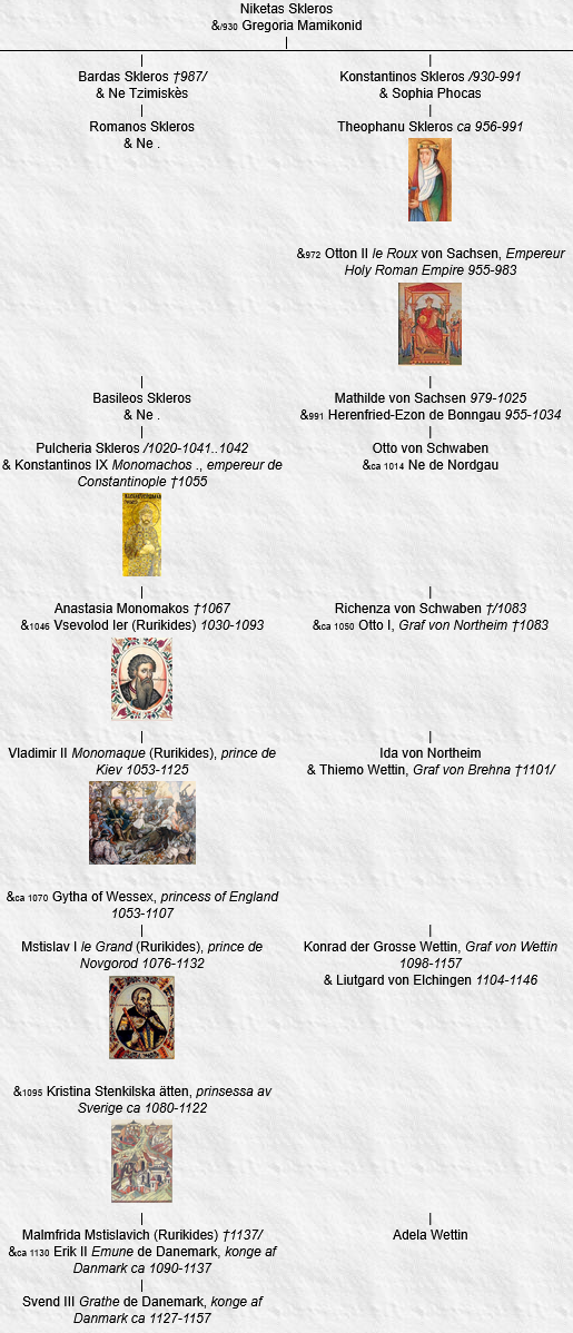 Valdemar Ier den Store, konge af Danmark1131-1182 &1154 Sofia (Rurikides) 1141-1198 1. Sophie, prinsesse af Danmarkca 1159-ca 1208 &1181 Siegfried, Graf von Orlamündeca 1150-1206 1.1. Hermann II. von Orlamünde †1247 & Beatrix von Andechs †1265/ 1.1.1. Sophie von Orlamünde & Heinrich VIII. von Weida †ca 1279 1.1.1.1. Heinrich IX. von Weida †1326 1.1.1.2. Heinrich von Weida 1.1.1.3. Heinrich X. von Weida †1293 1.1.2. Hermann III. von Orlamünde †1283 & Ne N 1.1.2.1. Hermann V. von Orlamünde 1.1.2.2. Heinrich III. von Orlamünde †1354/ 1.1.2.3. Elisabeth von Orlamünde ca 1260-1333 1.1.2.4. Elisabeth von Orlamünde 1.2. Ermengarde, Gräfin von Orlamündeca 1182-ca 1222 &ca 1190 Heinrich II, Graf von Schwarzburgca 1165-1236 1.2.1. Günther VII, Graf von Schwarzburg-Blankenburgca 1210-1275 &ca 1235 Sophie von Orlamünde 1.2.1.1. Günther IX, Graf von Schwarzburg-Blankenburg†1292/1293 1.2.1.2. Sophie von Schwarzburg †1279 1.2.1.3. Heinrich V, Graf von Schwarzburg-Blankenburgca 1235-ca 1285 1.2.1.4. Christiane, Gräfin von Schwarzburg 1.2.1.5. Ne von Schwarzburg 1.3. Albert I von Orlamünde 1183-1244 &/1211 Hedwig von Thüringen 1.3.1. Otto III von Orlamünde †1285 & Agnes von Leiningen †?1300 1.3.1.1. Hermann IV von Orlamünde †1319 1.3.1.2. Otto IV von Orlamünde 1271-1318 1.3.1.3. Irmgard von Orlamünde 1.4. Sophie von Orlamünde †1261 & Lambert, Graf von Gleichenca 1170-1227 1.4.1. Ernst von Gleichen & Ingeborg Strangesen 1.4.1.1. Ne von Gleichen 1.4.2. Adelheid von Gleichen ca 1200-ca 1267 & Ludvig von Everstein 1206-1283/ 1.4.2.1. Albrecht von Everstein ca 1230-1289 2. Knud IV, konge af Danmark1163-1202 &1177 Gertrud Welf †1196 3. Valdemar II Sejr, konge af Danmark1170-1241 & Helena Guttormsdotter Autaumsson 1167- &1200 Ingebiorg Welf 1174-/1204 &1205 Drahomira Přemyslide, Prinzessin von Böhmen?1189-1212 &1214 Berengária, infanta de Portugalca 1194-1221 3.1. Knud Valdemarsen 1211-1260 & Hedwig von Pomerellen 3.1.1. Svantepolk Knutsson ca 1230-1310 &ca 1250 Benedikta Sunesdotter Folkungaätten †ca 1261 3.1.1.1. Ingeborg Svantepolksdotter †/1341 3.1.1.2. Ingrid Svantepolksdotter †1350/ 3.1.2. Erik Knudsen Skarsholm †1304 & Elisabeth af Halland 3.1.2.1. Barnim Skarsholm †/1329 3.2. Valdemar, prins af Danmark1209-1231 & Ne N &1229 Leonor de Portugal 1211-1231 3.2.1. Sofie, prinsesse af Danmark†1241 &ca 1240 Henri-Burwin III von Mecklenburg, prince de Rostockca 1218-1278 3.2.1.1. Waldemar von Mecklenburg ca 1241-1282 3.2.1.2. Jean von Mecklenburg 3.2.2. Ne de Danemark 1231-1231 3.3. Erik IV Plovpenning, konge af Danmark1216-1250 &1239 Jutta von Sachsen ca 1223-?1250 3.3.1. Ingeburge, prinsesse af Danmark1244-1287 &1261 Magnus VI Yngling, kong av Norge1238-1280 3.3.1.1. Erik II, kong av Norge1268-1299 3.3.1.2. Haakon V, kong av Norge1270-1319 3.3.2. Sophie, prinsesse af Danmark†1286 &1260 Valdemar Folkungaätten, konung av Sverige1237-1302 3.3.2.1. Ingeborg Folkungaätten, prinsessa av Sverigeca 1260-?1290 3.3.2.2. Rikissa Folkungaätten, prinsessa av Sverige†1288..1293 3.4. Sophie, prinsesse af Danmark1217-1247 &?1236 Johann I, Markgraf von Brandenburgca 1213-1266/1267 3.4.1. Johann II, Markgraf von Brandenburg†1281 3.4.2. Otto IV mit dem Pfeil, Markgraf von Brandenburg†1308 3.4.3. Konrad II, Markgraf von Brandenburg1240-1304 &1260 Konstancja Piast 1245/1246-1281 3.4.3.1. Johann IV, Markgraf von Brandenburg1261-1305 3.4.3.2. Otto VII, Markgraf von Brandenburg1262-1297/1298 3.4.3.3. Waldemar, Markgraf von Brandenburg†1319 3.4.3.4. Agnes von Brandenburg ca 1275-1329 3.4.4. Helene von Brandenburg 1241/1242-1303/1304 & Dietrich IV, Markgraf von Landsberg1242-1285 3.4.4.1. Sophie Wettin ca 1260-1318 3.4.5. Erich von Brandenburg †1295 3.5. Abel, konge af Danmarkca 1218-1252 &1237 Mathilde, Gräfin von Holstein1225-1287 3.5.1. Valdemar III, Herzog von Schleswig†1257 3.5.2. Erik I, Herzog von Schleswigca 1240-1272 & Margareta von Rügen †1272 3.5.2.1. Valdemar IV, Herzog von Schleswig†1312 3.5.2.2. Éric, duc de Langeland1272-1310 3.5.3. Sofia, prinsesse af Danmarkca 1240-1284/ &1258 Bernhard I, Fürst von Anhalt-Bernburg†1286/1287 3.5.3.1. Bernhard II, Fürst von Anhalt-Bernburgca 1260-1324 3.5.3.2. Sofia, Prinzessin von Anhalt-Bernburgca 1260-1330 3.5.4. Abel de Danemark 1252-1279 3.6. Christoffer Ier, konge af Danmarkca 1219-1259 &1248 Margrethe Sambiria von Pomerellen 1230..1234-1282 3.6.1. Erik V Klipping, konge af Danmarkca 1249-1286 &1273 Agnes von Brandenburg 1257-1304 3.6.1.1. Erik VI Menved, konge af Danmark1274-1319 3.6.1.2. Richiza, prinsesse af Danmarkca 1275- 3.6.1.3. Christoffer II, konge af Danmark1276-1332 3.6.1.4. Margrethe, prinsesse af Danmark†1341 3.6.2. Margrete, prinsesse af Danmark1250-1306 & Johann II, Graf von Holstein-Kielca 1253-?1321 3.6.3. Mechtild, prinsesse af Danmark†1311 & Albrecht III, Markgraf von Brandenburgca 1250-1300 3.6.3.1. Otto von Brandenburg †1299/1300 3.6.3.2. Beatrix von Brandenburg †1314 3.6.3.3. Margareta von Brandenburg 1270/-1315 4. Ingeborg, prinsesse af Danmark1175-1236 &1193 Philippe II Auguste, roi de France1165-1223 5. Hélène, prinsesse af Danmark†1233 &1202 Wilhelm, Herzog von Braunschweig-Lüneburg1184-1213 5.1. Otto I das Kind, Herzog von Braunschweig-Lüneburg1204-1252 &1228 Mathilde von Brandenburg †1261 5.1.1. Mathilde von Braunschweig-Lüneburg †ca 1297 &1245 Heinrich II der Fette von Anhalt-Aschersleben †1266 5.1.1.1. Otto I von Anhalt-Aschersleben †1304/1305 5.1.2. Helene von Braunschweig-Lüneburg ca 1231-1273 &1247/1248 Albrecht I, Herzog von Sachsen†1261 5.1.2.1. Johann I, Herzog von Sachsen-Lauenburg1246/-1286 5.1.2.2. Albrecht II, Herzog von Sachsen-Wittenbergca 1250-1298 5.1.2.3. Helene von Sachsen ca 1255-1309 5.1.2.4. Elisabeth von Sachsen †1293..1306 5.1.3. Albrecht I der Löw, Herzog von Braunschweig1236-1279 & Elisabeth de Brabant 1243-1261 &1263 Alessina di Monferrato ca 1240-1285 5.1.3.1. Mathilde von Braunschweig-Lüneburg /1261-1319 