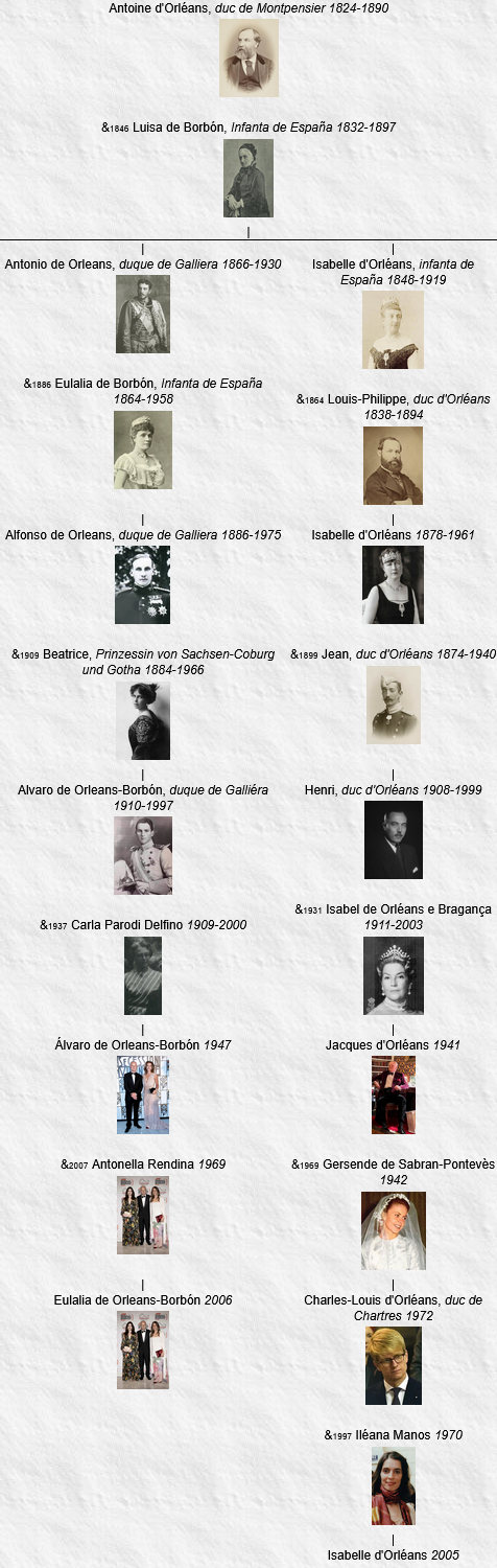30Antoine d’Orléans, duc de Montpensier, Infante de España (1859-1868), duque de Galliera (3e, 1888-1890), né le 31 juillet 1824, Neuilly-sur-Seine (Hauts-de-Seine), baptisé, palais des Tuileries (Paris), décédé le 4 février 1890, San Lucar de Barrameda (Espagne), inhumé, Panthéon des Infants de L’Escurial (Espagne) (à l’âge de 65 ans).