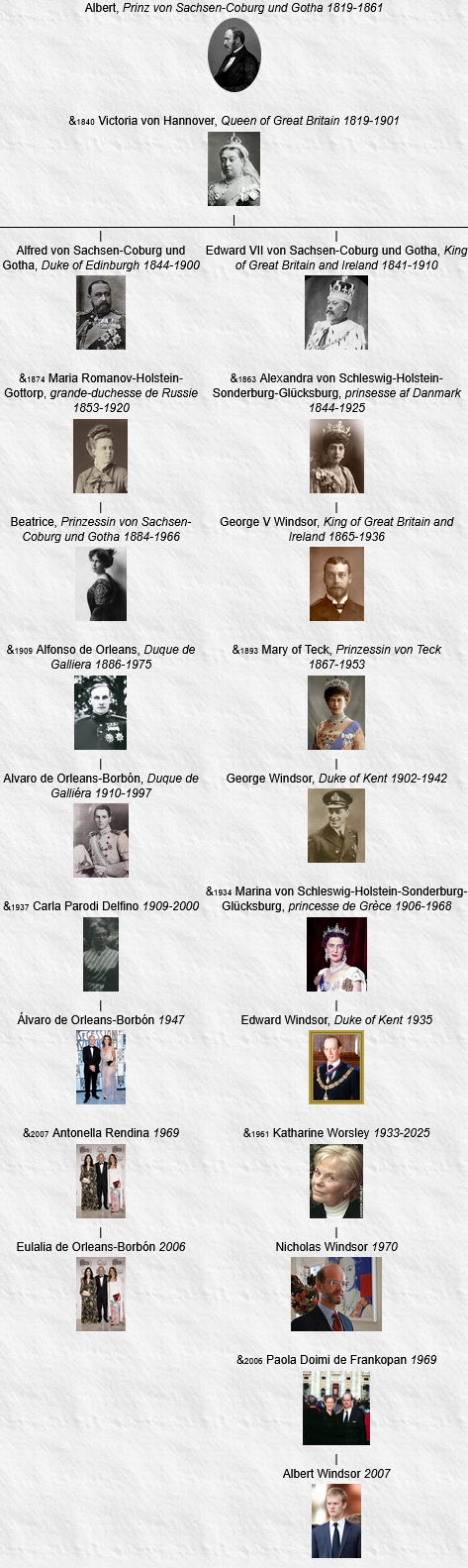 5Victoria Eugenie, Prinzessin von Battenberg, née le 24 octobre 1887, Balmoral, Grampian, Scotland (United Kingdom), décédée le 15 avril 1969, villa Vieille Fontaine, avenue de l’Elysée 24, Lausanne, canton de Vaud (Suisse), inhumée le 18 avril 1969, cimetière du Bois-de-Vaux, Lausanne, canton de Vaud (Suisse), transférée le 25 avril 1985 au Panthéon des Rois de L’Escurial (Espagne) (à l’âge de 81 ans).