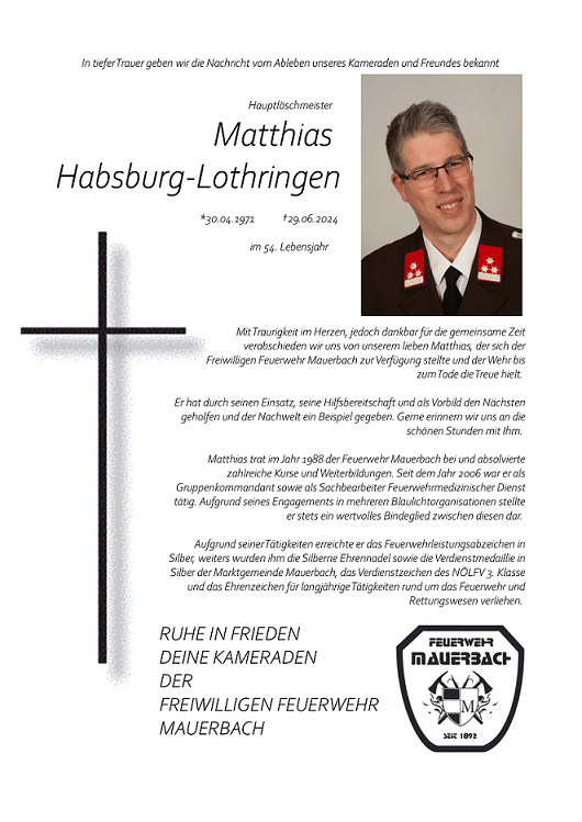 Heinrich Orsini-Rosenberg gibt im eigenen sowie im Namen seiner Mutter Marie Eleonore Fürstin von Orsini und Rosenberg, geborene Gräfin von Thun und Hohenstein, seiner Geschwister Paul Graf von Orsini und Rosenberg und Johanna Schwarz, geborene Gräfin von Orsini und Rosenberg, seiner Gemahlin Maria-Lucia Fürstin von Orsini und Rosenberg, geborene Gräfin von Gudenus, seines Schwagers Philipp Schwarz und seiner Schwägerin Louise Gräfin von Orsini und Rosenberg, geborene Müller-Schönau, seiner Kinder Ida, Ferdinand und Eleonore, seiner Neffen und Nichten Alice, Marie-Eleonore, Apollonia und Zeno, seiner Onkeln und Tanten, seiner Cousins und Cousinen, sowie im Namen aller Verwandten tief betrübt Nachricht,