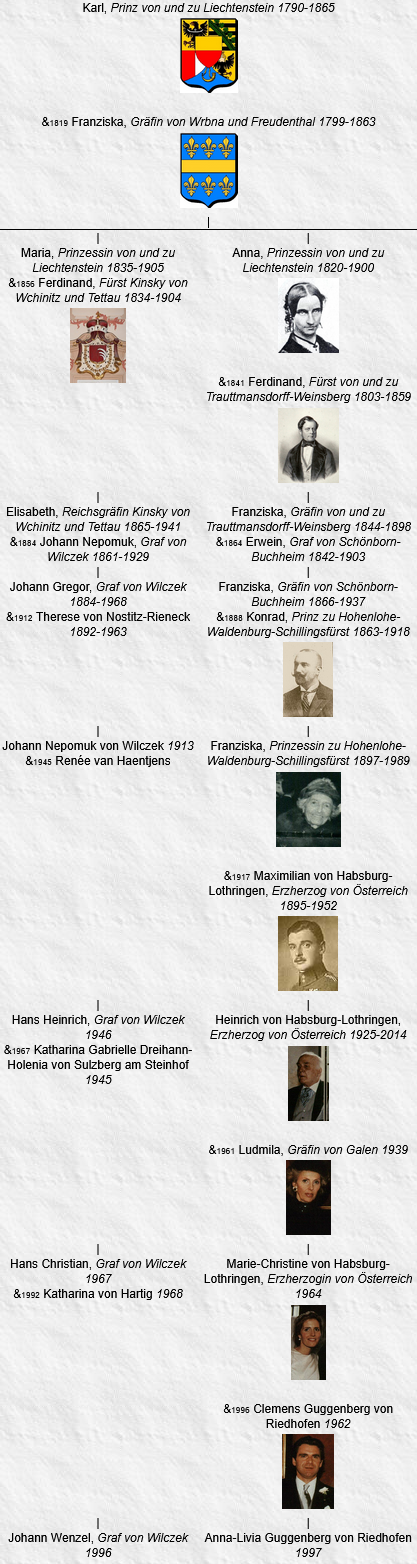 Franz Joseph I, Kaiser von Österreich 1830-1916 &1854 Elisabeth, Herzogin in Bayern 1837-1898 1. Sophia, Erzherzogin von Österreich 1855-1857 2. Gisela, Erzherzogin von Österreich 1856-1932 &1873 Leopold, Prinz von Bayern 1846-1930 2.1. Elisabeth, Prinzessin von Bayern 1874-1957 &1893 Otto, Graf von Seefried auf Buttenheim 1870-1951 2.1.1. Gisela, Gräfin von Seefried auf Buttenheim 1895-1895 2.1.2. Elisabeth, Gräfin von Seefried auf Buttenheim 1897-1975 2.1.3. Augusta, Gräfin von Seefried auf Buttenheim 1899-1978 &1919 Adalbert, Prinz von Bayern 1886-1970 2.1.3.1. Constantin, Prinz von Bayern 1920-1969 &1942 Maria Aldegunde, Prinzessin von Hohenzollern 1921-2006 &1953 Helene von Khevenhüller-Metsch 1921-2017 2.1.3.1.1. Leopold, Prinz von Bayern 1943 &1977 Ursula Möhlenkamp 1947 2.1.3.1.1.1. Manuel, Prinz von Bayern 1972 &2005 Anna-Natascha, Prinzessin zu Sayn-Wittgenstein-Berleburg 1978 2.1.3.1.1.1.1. Leopold von Wittelsbach 2007 2.1.3.1.1.1.2. Alva von Wittelsbach 2010 2.1.3.1.1.1.3. Gabriel von Wittelsbach 2014 2.1.3.1.1.1.4. Joseph von Wittelsbach 2019 2.1.3.1.1.2. María del Pilar, Prinzessin von Bayern 1978 2.1.3.1.1.3. Felipa, Prinzessin von Bayern 1981 &2012 Christian Dienst 1978 2.1.3.1.1.3.1. August Dienst 2013 2.1.3.1.1.3.2. Ferdinand Dienst 2014 2.1.3.1.1.3.3. Otto Dienst 2017 2.1.3.1.1.4. Konstantin, Prinz von Bayern 1986 &2018 Deniz Kaya 1990 2.1.3.1.1.4.1. Alexis, Prinz von Bayern 2020 2.1.3.1.1.4.2. Nikolaus, Prinz von Bayern 2023 2.1.3.1.2. Adalbert, Prinz von Bayern 1944 &1978 Maria Donata Malkovsky 1945 &1986 Sandra Burghardt 1966 2.1.3.1.2.1. Bernadette-Désirée, Prinzessin von Bayern 1986 &2016 Carmelo Milici 1987 2.1.3.1.2.1.1. Mia Milici 2018 2.1.3.1.2.2. Hubertus, Prinz von Bayern 1989 &2023 Catiana Kärcher 1996 2.1.3.1.3. Ysabel, Prinzessin von Bayern 1954 &1976 Alfred Hoyos 1951 2.1.3.1.3.1. Stephanie Hoyos 1977 &2006 Franz von Brackel 1971 2.1.3.1.3.1.1. Constantin von Brackel 2006 2.1.3.1.3.1.2. Antonia von Brackel 2008 2.1.3.1.3.1.3. Johanna von Brackel 2010 2.1.3.1.3.2. Johannes Hoyos 1978 &2013 Veronika Wundsam 1980 2.1.3.1.3.2.1. Balthasar Hoyos 2015 2.1.3.1.3.2.2. Ludwig Hoyos 2017-2017 2.1.3.1.3.2.3. Antonius Hoyos, Graf von Hoyos 2018 2.1.3.2. Alexander, Prinz von Bayern 1923-2001 2.1.4. Marie Valerie, Gräfin von Seefried auf Buttenheim 1901-1972 &1923 Rudolf von Stengel 1899-1969 &1933 Wilhelm Otto von Riedemann 1903-1940 2.1.4.1. Heinrich von Stengel 1924-1943 2.1.4.2. Anna Maria von Riedemann 1934-1985 2.1.4.3. Maria Pia von Riedemann 1938 2.1.5. Franz Josef, Graf von Seefried auf Buttenheim 1904-1969 &1941 Gabriele von Schnitzler 1918-2017 2.1.5.1. Franz Georg, Graf von Seefried auf Buttenheim 1942 & Felicitas Ruth Schmlumpf 2.1.5.2. Ferdinand, Graf von Seefried auf Buttenheim 1944 &1973 Monique Brouillet 1950 2.1.5.2.1. Valerie, Gräfin von Seefried auf Buttenheim 1978 &2007 Joseph Welles Henderson 1977 2.1.5.2.1.1. Joseph Welles Henderson 2009 2.1.5.2.1.2. Charlotte Henderson 2.1.5.2.1.3. Max Henderson 2.1.5.2.2. Christine, Gräfin von Seefried auf Buttenheim 1980 &2005 Jean-Martin de Wendel 1978 2.1.5.2.2.1. Claire de Wendel 2010 2.1.5.2.2.2. Marc de Wendel 2012 2.1.5.2.2.3. Georges de Wendel 2016 2.1.5.2.3. Paul, Graf von Seefried auf Buttenheim 1982 &2020 Chelsey Nicole Perry 1990 2.1.5.2.3.1. Silvester Brave von Seefried auf Buttenheim 2021 2.1.5.2.3.2. Casper von Seefried auf Buttenheim 2023 2.1.5.3. Isabel, Gräfin von Seefried auf Buttenheim 1949 &1971 Martin Hoyos 1947 2.1.5.3.1. Natalie Hoyos 1973 2.1.5.3.2. Ferdinand Hoyos 1976 &2006 Izabel Julia Mellinghoff 2.1.5.3.2.1. Helena Hoyos 2007 2.1.5.3.2.2. Heinrich Hoyos 2010 2.1.5.3.2.3. Tassilo Hoyos 2012 2.1.5.3.3. Clemens Hoyos 1981 &2012 Sophie, Prinzessin von und zu Liechtenstein 1983 2.1.5.3.3.1. Constantin Hoyos 2.1.5.3.3.2. Albrecht Hoyos 2.1.5.4. Johannes, Graf von Seefried auf Buttenheim 1959 2.2. Augusta, Prinzessin von Bayern 1875-1964 &1893 Joseph, Erzherzog von Österreich 1872-1962 2.2.1. Josef, Erzherzog von Österreich 1895-1957 &1924 Anna, Prinzessin von Sachsen 1903-1976 2.2.1.1. Margit, Erzherzogin von Österreich 1925-1979 &1943 Alexander Erba Odescalchi, Principe di Monteleone 1914-2008 2.2.1.1.1. Sybilla Erba Odescalchi 1945-2011 &1967 Samir Fawzi Beshai-Bekkeit 1938-1979 2.2.1.1.1.1. Augustin Beshai, Principe di Monteleone 1968 &1991 Gertrud Blomquist 1966 &2000 Åsa Katarina Stenhammar 1972 2.2.1.1.1.1.1. Erik Beshai 2001 2.2.1.1.1.1.2. Ellen Beshai 2004 2.2.1.1.1.2. Hélène Beshai 1969 &1992 Lars Magnus Petersson 1965 2.2.1.1.1.2.1. Sarah Petersson 1996 2.2.1.1.1.3. Eléonore Beshai 1974 2.2.1.2. Helene, Erzherzogin von Österreich 1927-2011 &1946 Georg Alexander, Herzog zu Mecklenburg 1921-1996 2.2.1.2.1. Elisabeth Christine, Herzogin von Mecklenburg-Strelitz 1947 &1975 Alhard von dem Bussche-Ippenburg genannt von Kessel 1947 2.2.1.2.1.1. Ricarda von dem Bussche-Ippenburg genannt von Kessel 1978-2022 &2002 Werner Diego von Bergen 1955 &2020 Mervyn Bienek 2.2.1.2.1.1.1. Theodor von dem Bussche 2019 2.2.1.2.1.2. Josina von dem Bussche-Ippenburg genannt von Kessel 1979 &2017 Grant Harvey Dudson 1980 2.2.1.2.1.3. Gabriel von dem Bussche-Ippenburg genannt von Kessel 1983 &2014 Camilla Wegener 2.2.1.2.1.3.1. Otilia Augusta von dem Bussche-Ippenburg genannt von Kessel 2017 2.2.1.2.2. Maria Katharina, Herzogin von Mecklenburg-Strelitz 1949 &1978 Wolfgang von Wasielewski 1951 2.2.1.2.2.1. Marie-Nathalie von Wasielewski 1981 &2010 Constantin von Reitzenstein 1982 2.2.1.2.2.1.1. Helena von Reitzenstein 2011 2.2.1.2.2.1.2. Ferdinand von Reitzenstein 2013 2.2.1.2.2.1.3. Kyrill von Reitzenstein 2015 2.2.1.2.2.1.4. Sophie von Reitzenstein 2018 2.2.1.2.2.2. Alexandre von Wasielewski 1983 &2017 Jeanny Gering 1986 2.2.1.2.2.2.1. Alma von Wasielewski 2020 2.2.1.2.3. Irene, Herzogin von Mecklenburg-Strelitz 1952 &1980 Constantin Harmsen 1954 2.2.1.2.3.1. Maximilian Harmsen 1982 &2008 Marianna, Reichsgräfin von und zu Westerholt und Gysenberg 1982 2.2.1.2.3.1.1. Paulina Har
