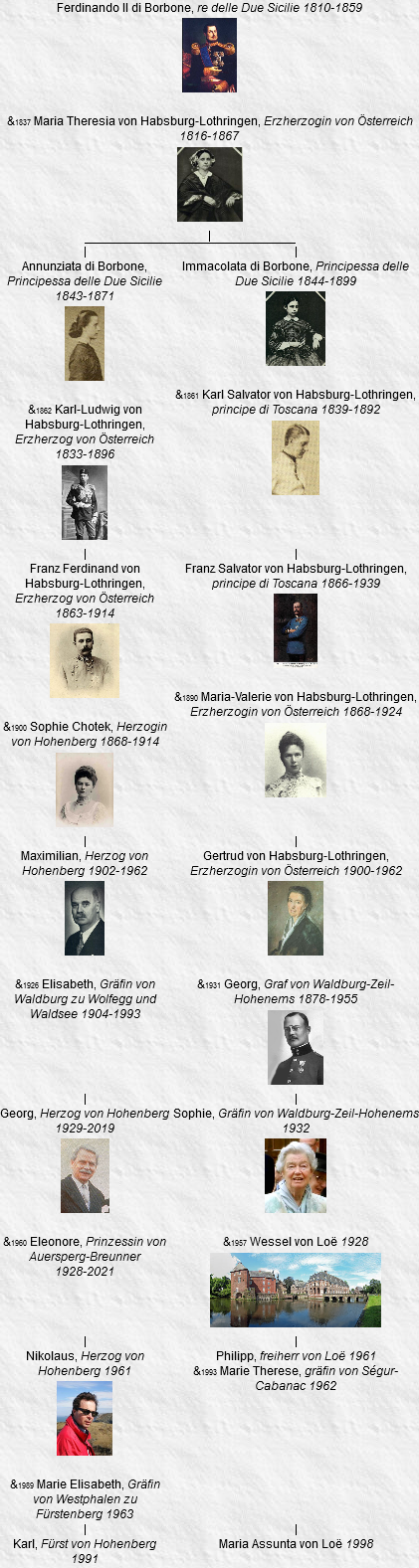 Louise, princesse de France 1819-1864 &1845 Carlo III, duca di Parma 1823-1854 3.1. Margherita, principessa di Parma 1847-1893 &1867 Carlos, Duque de Madrid 1848-1909 3.1.1. Blanca, princesse de Borbon 1868-1949 3.1.2. Jaime III, duc d’Anjou 1870-1931 3.1.3. Elvire, princesse de Bourbon 1871-1929 3.1.4. Béatrix de Bourbon 1874-1961 3.1.5. Alice de Bourbon 1876-1975 3.2. Roberto, duca di Parma 1848-1907 &1869 Pia, principessa delle Due Sicilie 1849-1882 &1884 Maria Antónia, infanta de Portugal 1862-1959 3.2.1. Maria Luisa, Principessa di Borbone Parma 1870-1899 3.2.2. Ferdinando, prince de Plaisance 1871-1872 3.2.3. Luisa di Borbone 1872-1943 3.2.4. Enrico Ier di Borbone, duca di Parma 1873-1939 3.2.5. Immacolata di Borbone 1874-1914 3.2.6. Joseph di Borbone, duca di Parma 1875-1950 3.2.7. Teresa di Borbone 1876-1959 3.2.8. Pia di Borbone 1877-1915 3.2.9. Béatrix, Principessa di Borbone Parma 1879-1946 3.2.10. Élie, duca di Parma 1880-1959 3.2.11. Anastasia, Principessa di Parma 1881-1881 3.2.12. Augusto di Borbone, Principe di Parma 1882-1882 3.2.13. Maria della Neve di Borbone 1885-1959 3.2.14. Sixte, prince de Bourbon-Parme 1886-1934 3.2.15. Xavier, duca di Parma 1889-1977 3.2.16. Francesca di Borbone 1890-1978 3.2.17. Zita, Principessa di Borbone Parma 1892-1989 3.2.18. Félix, prince de Luxembourg 1893-1970 3.2.19. René, prince de Parme 1894-1962 3.2.20. Maria Antonia di Borbone 1895-1977 3.2.21. Isabella di Borbone 1898-1984 3.2.22. Louis, prince de Parme 1899-1967 3.2.23. Enrichetta, principessa di Borbone Parma 1903-1987 3.2.24. Gaëtan, prince de Bourbon-Parme 1905-1958 3.3. Alicia, Principessa di Borbone Parma 1849-1935 &1868 Ferdinando IV, Erzherzog von Österreich 1835-1908 3.3.1. Leopold Wölfling 1868-1935 3.3.2. Luise, comtesse de Montignoso 1870-1947 3.3.3. Joseph Ferdinand, Erzherzog von Österreich 1872-1942 3.3.4. Peter Ferdinand, Erzherzog von Österreich 1874-1948 3.3.5. Heinrich Ferdinand, Erzherzog von Österreich 1878-1969 3.3.6. Anna Maria, Erzherzogin von Österreich 1879-1961 3.3.7. Margareta, Erzherzogin von Österreich 1881-1965 3.3.8. Germana von Habsburg-Lothringen 1884-1955 3.3.9. Robert Ferdinand von Habsburg-Lothringen 1885-1895 3.3.10. Agnes Maria von Habsburg-Lothringen 1891-1945 3.4. Enrico, comte de Bardi 1851-1905 &1873 Luisa, principessa delle Due Sicilie 1855-1874 &1876 Aldegundes de Bragança, duquesa de Guimarães 1858-1946