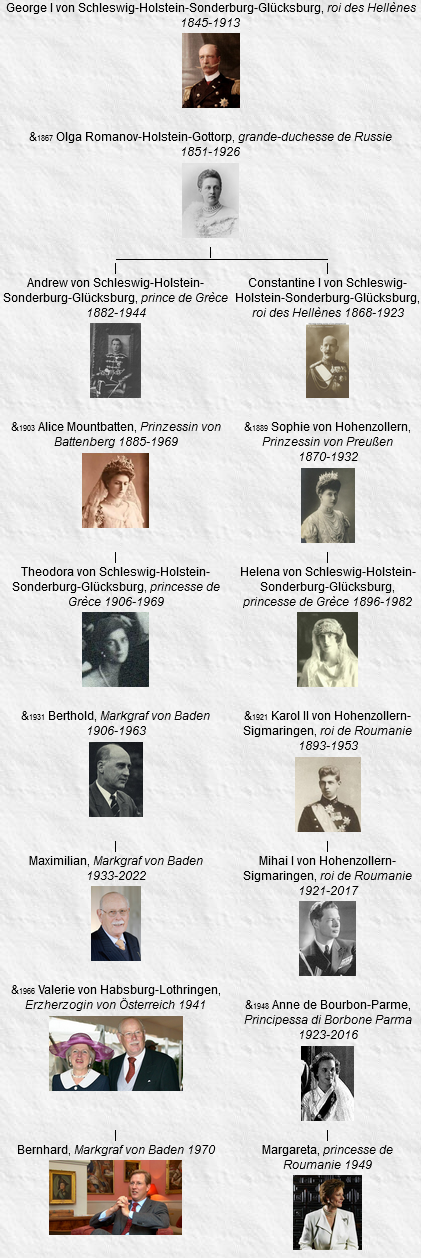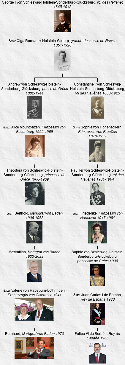 - George I, né le 24 décembre 1845, Copenhague (Danemark), assassiné le 18 mars 1913, Thessalonique (Grèce) (à l’âge de 67 ans). Voir 20.