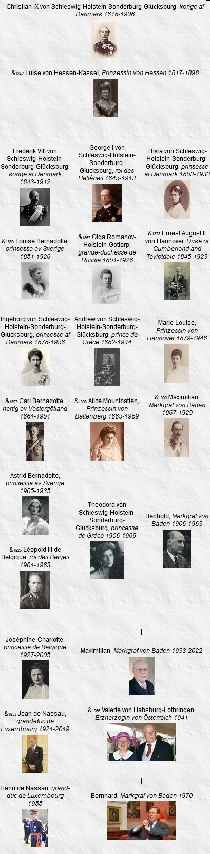 38 Christian IX, konge af Danmark (15 novembre 1863 – 29 janvier 1906), prins af Danmark, né le 8 avril 1818, Schloss Gottorf, Schleswig, Schleswig-Holstein (Deutschland), décédé le 29 janvier 1906, Amalienborg, København (Danmark), inhumé, Glücksborgernes kapel, Domkirke, Roskilde, Sjælland (Danmark) (à l’âge de 87 ans).