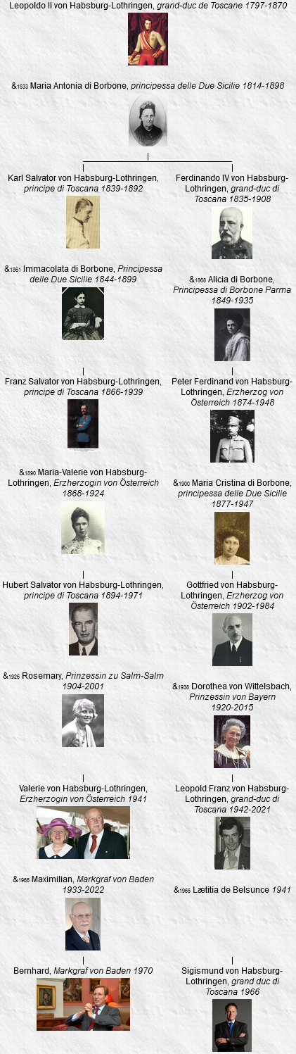 6 Hubert Salvator, Erzherzog von Österreich, principe di Toscana, né le 30 avril 1894, château de Lichtenegg, décédé le 24 mars 1971, château de Persenberg (Autriche) (à l’âge de 76 ans).