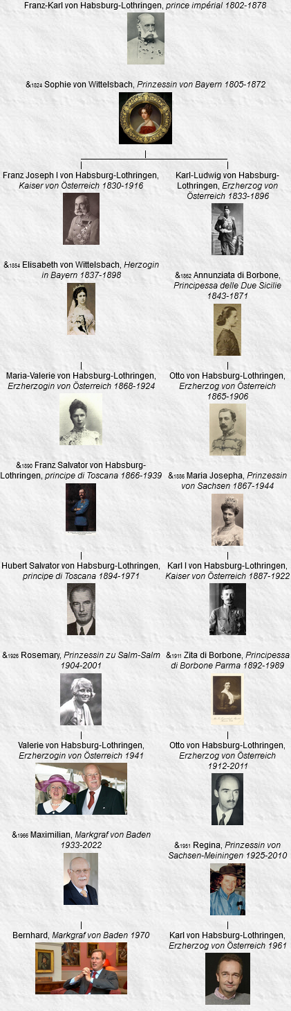 52 Franz-Karl, prince impérial, Erzherzog von Österreich, né le 7 décembre 1802, Wien (Österreich), décédé le 8 mars 1878, Wien (Österreich) (à l’âge de 75 ans).