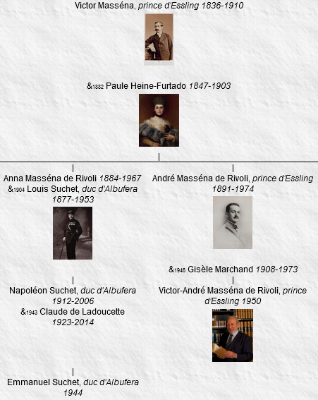 4 Louis Suchet, duc d’Albufera (4e), comte Suchet d’Albuféra (4e), né le 4 mai 1877, Paris, décédé le 13 juin 1953, Ville-d’Avray (Hauts-de-Seine) (à l’âge de 76 ans).