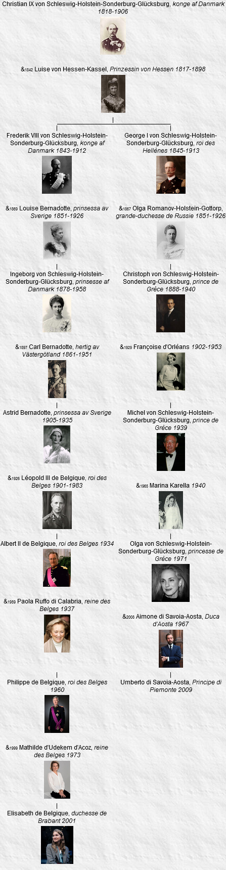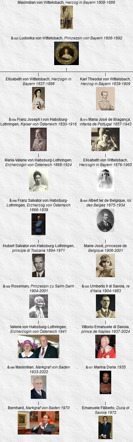 7 Elisabeth, Herzogin in Bayern, née le 25 juillet 1876, Possenhofen, Bayern (Deutschland), décédée le 23 novembre 1965, château de Stuyvenberg, à Laeken (Belgique) (à l’âge de 89 ans).