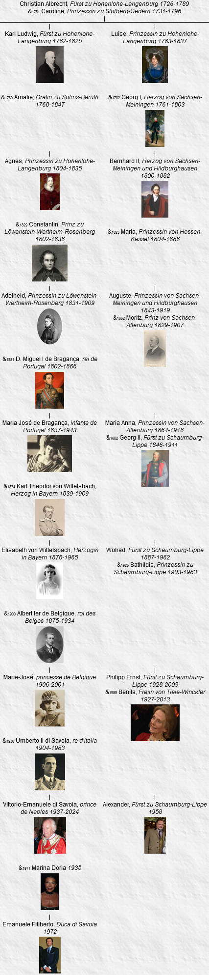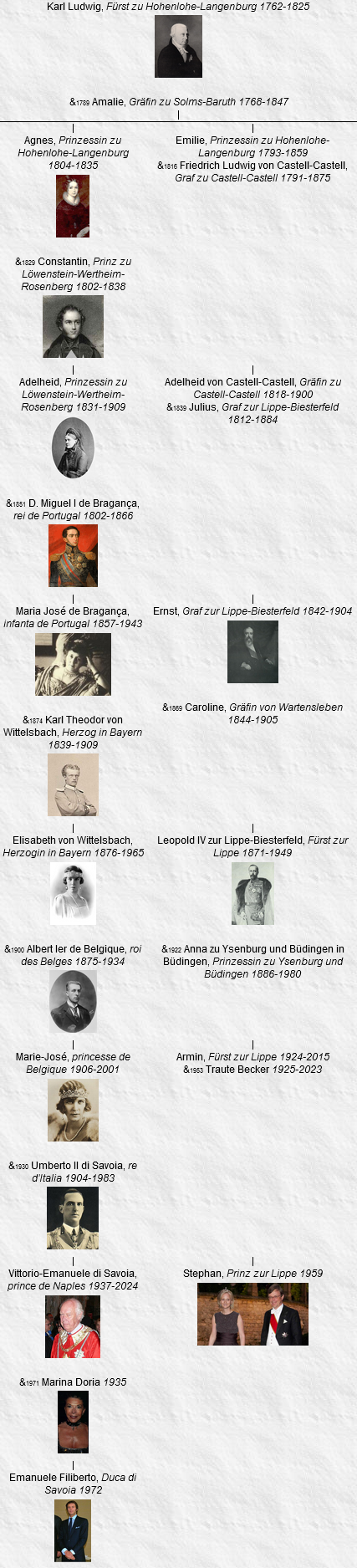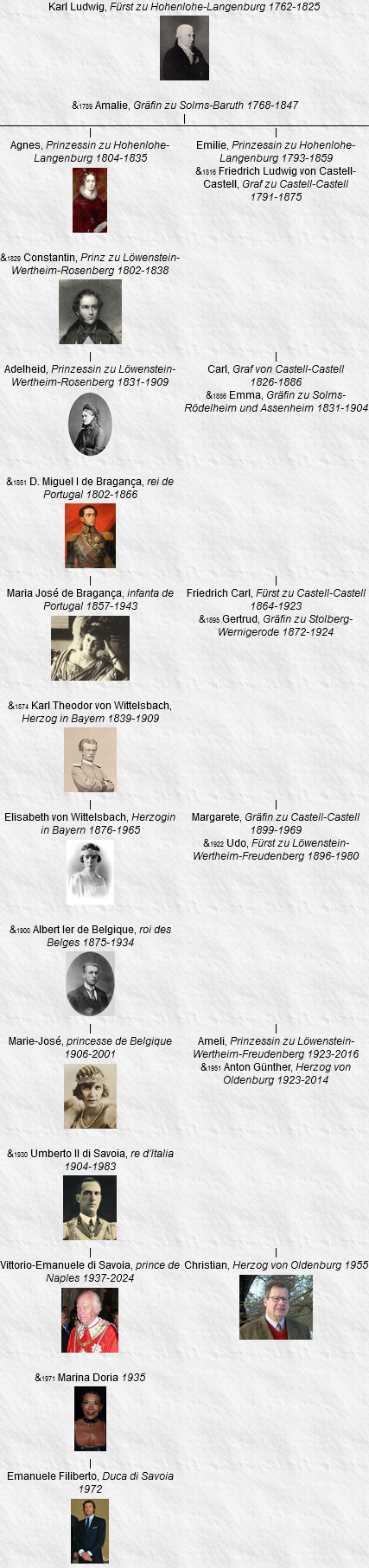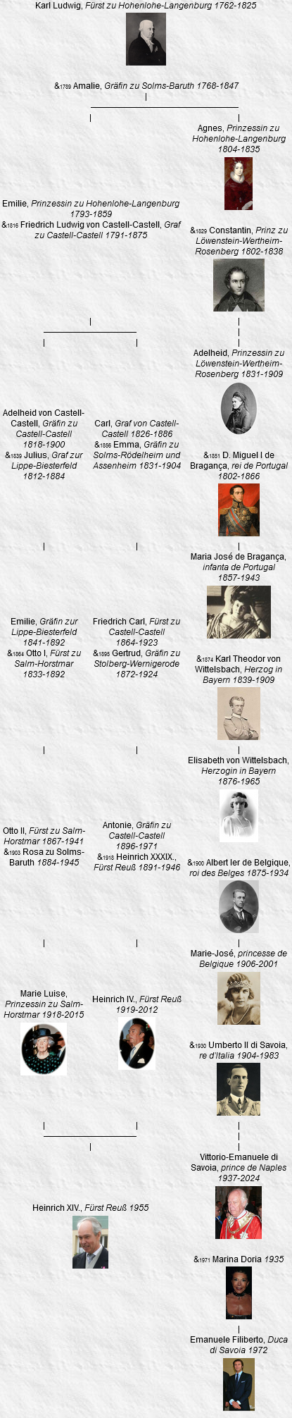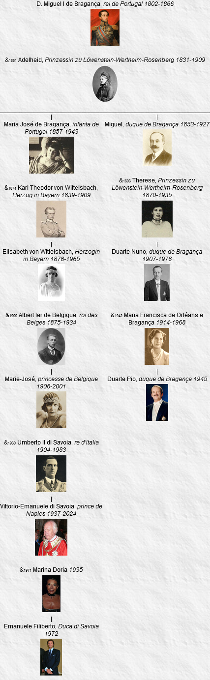 2. Maria das Neves de Bragança 1852-1941 &1871 Alfonso Carlos de Borbón, duc d’Anjou1849-1936 3. Miguel de Bragança 1853-1927 &1877 Elisabeth, Prinzessin von Thurn und Taxis1860-1881 &1893 Therese, Prinzessin zu Löwenstein-Wertheim-Rosenberg1870-1935 3.1. Miguel de Bragança, duque de Viseu1878-1923 &1909 Anita Stewart 1886-1977 3.1.1. Isabel de Bragança 1910-1946 &1930 Woldiemierz Dorozynsky 1906-1933 &1942 René Millet 1910-1978 3.1.1.1. Alexandre Dorozynsky 1931 & Danuta Refke-Birke 1928-2009 &1963 Ariane Duplaix 1940 & Sabine Clerget-Vaucouleurs 1948-2017 3.1.1.1.1. Tatiana Sophie Dorozynsky 1966 3.1.1.1.2. Alexia Dorozynsky 3.1.2. João Miguel de Bragança 1912-1991 &1948 Winifred Gray 1917-2010 &1971 Katherine King 1921-2007 3.1.2.1. Michael William de Bragança 1951 &1980 Barbara Haliburton Fales 1955 3.1.2.1.1. Miguel de Bragança 1986 3.1.2.1.2. Annabel de Bragança 1989 &2019 Andrea Papi 3.1.2.1.3. Camilla Fales de Bragança 1990 &2023 Marco Lorenzo Hartmann 3.1.3. Miguel de Bragança 1915-1996 &1946 Anne Hughson 1921-2017 3.1.3.1. Anita de Bragança 1947 &1968 George Alfred Wardman 1946 &1982 John Jason Stockbridge 1943 3.1.3.1.1. George Stewart Wardman 1968 & Kirsten Leigh Pietila 3.1.3.1.1.1. Finn Wardman 2002-2023 3.1.3.1.1.2. Somers Wardman 3.1.3.1.2. Tiffany Anne Wardman 1971 3.1.3.2. Michael de Bragança 1953 3.2. Francisco José de Bragança, infante de Portugal1879-1919 3.3. Maria Teresa de Bragança 1881-1945 &1900 Ludwig, Prinz von Thurn und Taxis1863-1942 3.4. Maria Isabel de Bragança 1894-1970 &1920 Franz Josef, Fürst von Thurn und Taxis1893-1971 3.4.1. Gabriel, Prinz von Thurn und Taxis1922-1942 3.4.2. Michaele, Prinzessin von Thurn und Taxis1922-1922 3.4.3. Helene, Prinzessin von Thurn und Taxis1924-1991 &1947 Rudolf, Graf von Schönborn-Wiesentheid1918-1998 3.4.3.1. Albert, Graf von Schönborn-Wiesentheid1948 &1975 Ilona Dietrich 1947 3.4.3.1.1. Moritz, Graf von Schönborn-Wiesentheid1977 &2014 Stephanie Maul 1981 3.4.3.1.1.1. Helena von Schönborn-Wiesentheid 2014 3.4.3.1.2. Konstantin, Graf von Schönborn-Wiesentheid1979-1998 3.4.3.2. Johannes, Graf von Schönborn-Wiesentheid1949 &1977 Marie-Antoinette, Prinzessin zu Fürstenberg1949 &2000 Anita Tewarson 1961 3.4.3.3. Gabriela, Gräfin von Schönborn-Wiesentheid1950 &1969 Alexander, Fürst zu Sayn-Wittgenstein-Sayn1943 3.4.3.3.1. Heinrich, Prinz zu Sayn-Wittgenstein-Sayn1971 &2003 Priscilla Incisa della Rocchetta 1975 3.4.3.3.1.1. Ludovico zu Sayn-Wittgenstein-Sayn 2006 3.4.3.3.1.2. Eleonora zu Sayn-Wittgenstein-Sayn 2008 3.4.3.3.2. Alexandra, Prinzessin zu Sayn-Wittgenstein-Sayn1973 &1994 Carl-Eugen zu Oettingen-Wallerstein 1970 &2006 Stefano Hunyady de Kéthely 1968 3.4.3.3.2.1. Helena, Prinzessin zu Oettingen-Oettingen und Oettingen-Wallerstein1995 &2024 Max Masuda-Farkas. 1995 3.4.3.3.2.2. Johannes, Prinz zu Oettingen-Oettingen und Oettingen-Wallerstein1998 3.4.3.3.2.3. Elisabetta Hunyady de Kéthely 2007 3.4.3.3.2.4. Laszlo Hunyady de Kéthely 2009 3.4.3.3.3. Casimir, Prinz zu Sayn-Wittgenstein-Sayn1976 &2000 Corinna Larsen 1964 &2019 Alana Bunte 1990 3.4.3.3.3.1. Alexander zu Sayn-Wittgenstein-Sayn 2002 3.4.3.3.3.2. Salentin, Prinz zu Sayn-Wittgenstein-Sayn2020 3.4.3.3.3.3. Georg, Prinz zu Sayn-Wittgenstein-Sayn2023 3.4.3.3.3.4. Anunciata, Prinzessin zu Sayn-Wittgenstein-Sayn,2024 3.4.3.3.4. Filippa, Prinzessin zu Sayn-Wittgenstein-Sayn1980-2001 &2001 Vittorio Mazzetti d’Albertis 1965 3.4.3.3.5. Ludwig, Prinz zu Sayn-Wittgenstein-Sayn1982 &2011 Philippa, Gräfin Spannocchi1982 3.4.3.3.5.1. Vinzenz Alexander zu Sayn-Wittgenstein-Sayn 2012 3.4.3.3.5.2. Ladislaja zu Sayn-Wittgenstein-Sayn 2015 3.4.3.3.6. Sofia, Prinzessin zu Sayn-Wittgenstein-Sayn1986 &2020 Archia Akhavan-Kharazian 1990 3.4.3.3.6.1. Filippa Akhavan-Kharazian 2021 3.4.3.3.7. Peter, Prinz zu Sayn-Wittgenstein-Sayn1992 3.4.3.4. Peter, Graf von Schönborn-Wiesentheid1954 &1994 Bénédicte Courtin 1964 3.4.3.4.1. Alana, Gräfin von Schönborn-Wiesentheid1994 3.4.3.4.2. Janina, Gräfin von Schönborn-Wiesentheid1995 &2017 Wolfram von der Leyen und zu Hohengeroldseck 1990 3.4.3.4.2.1. Roch von der Leyen und zu Hohengeroldseck 2018 3.4.3.4.2.2. Apolline von der Leyen und zu Hohengeroldseck 2020 3.4.4. Maria Theresia, Prinzessin von Thurn und Taxis1925-1997 &1955 Franz Eduard, Graf von Oppersdorff1919-1985 3.4.4.1. Ferdinanda Franziska, Gräfin von Oppersdorff1956 &1987 Moritz Koch 1954-2009 3.4.4.1.1. Edwarda von Oppersdorff 1989 3.4.4.1.2. Bernhard von Oppersdorff 1991 3.4.4.2. Maria Gabrielle, Gräfin von Oppersdorff1957 & ? Riedmair &1987 Joachim Alois Heid 1958 3.4.4.3. Franz Joseph, Graf von Oppersdorff1958 &1997 Sonporn Phasukrit 1976 3.4.4.3.1. Jasmin Maria Theresia Michaela Fernanda Gabriela von Oppersdorff 1999 3.4.4.4. Margarethe, Gräfin von Oppersdorff1959 3.4.4.5. Michael Friedrich, Graf von Oppersdorff1962-1987 3.4.5. Maria Ferdinanda, Prinzessin von Thurn und Taxis1927-2018 &1950 Franz Josef von Hohenzollern-Sigmaringen, Prinz von Hohenzollern1926-1996 3.5. Maria Benedita de Bragança 1896-1971 3.6. Mafalda de Bragança 1898-1918 3.7. Maria Ana, infanta de Portugal1899-1971 &1921 Karl August, Fürst von Thurn und Taxis1898-1982 3.7.1. Clotilde, Prinzessin von Thurn und Taxis1922-2009 &1944 Johannes Moritz, Prinz von und zu Liechtenstein1914-2004 3.7.1.1. Dietmut, Prinzessin von und zu Liechtenstein1949 &1982 Ulrich Köstlin 1952 3.7.1.1.1. Clemens Köstlin 1983 3.7.1.1.2. Luise Köstlin 1984 3.7.1.2. Gundakar, Prinz von und zu Liechtenstein1949 &1989 Marie d’Orléans 1959 3.7.1.2.1. Léopoldine, Prinzessin von und zu Liechtenstein1990 3.7.1.2.2. Maria Immaculata, Prinzessin von und zu Liechtenstein1991 3.7.1.2.3. Johann-Wenzel, Prinz von und zu Liechtenstein1993 &2023 Felicitas von Hartig 1994 3.7.1.2.3.1. Josefine, Prinzessin von und zu Liechtenstein2024 3.7.1.2.4. Marguerite, Prinzessin von und zu Liechtenstein1995 3.7.1.2.5. Gabriel, Prinz von und zu Liechtenstein1998 3.7.1.3. Alfred, Prinz von und zu Liechtenstein195