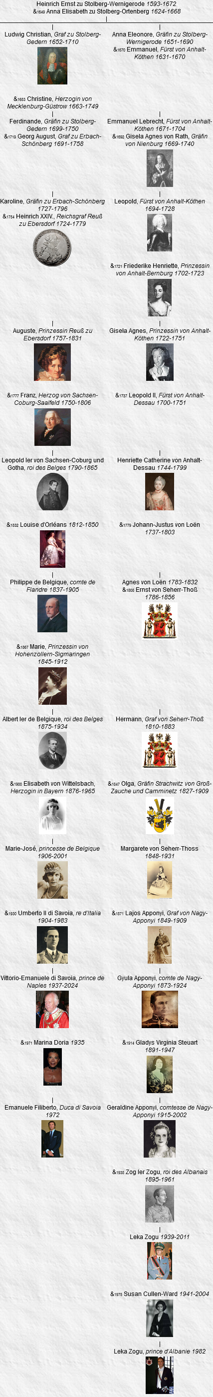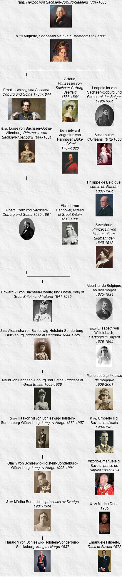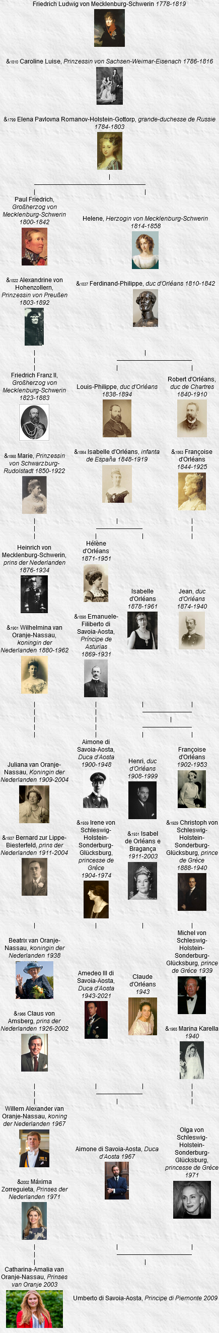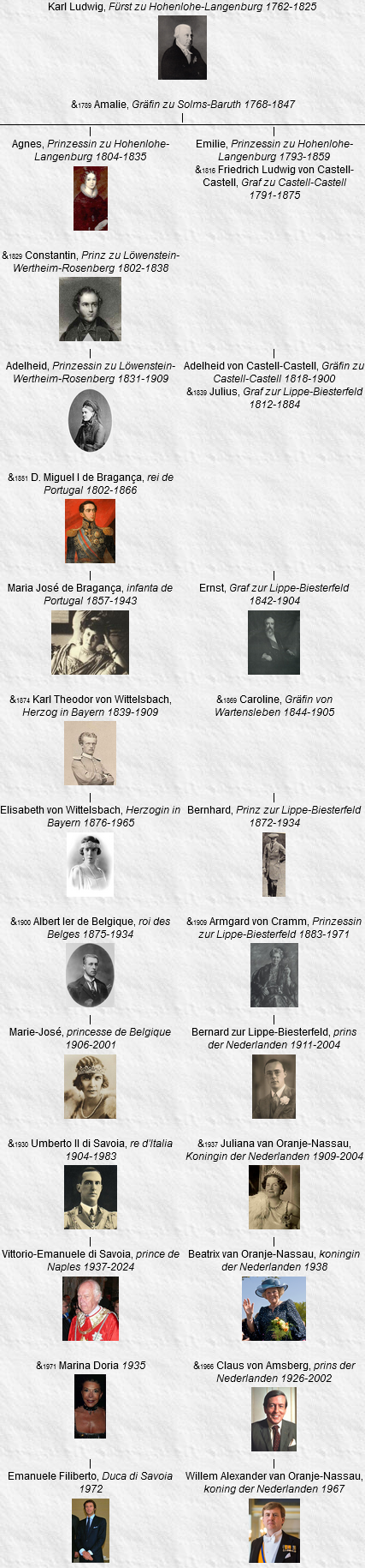 2. Maria das Neves de Bragança 1852-1941 &1871 Alfonso Carlos de Borbón, duc d’Anjou1849-1936 3. Miguel de Bragança 1853-1927 &1877 Elisabeth, Prinzessin von Thurn und Taxis1860-1881 &1893 Therese, Prinzessin zu Löwenstein-Wertheim-Rosenberg1870-1935 3.1. Miguel de Bragança, duque de Viseu1878-1923 &1909 Anita Stewart 1886-1977 3.1.1. Isabel de Bragança 1910-1946 &1930 Woldiemierz Dorozynsky 1906-1933 &1942 René Millet 1910-1978 3.1.1.1. Alexandre Dorozynsky 1931 & Danuta Refke-Birke 1928-2009 &1963 Ariane Duplaix 1940 & Sabine Clerget-Vaucouleurs 1948-2017 3.1.1.1.1. Tatiana Sophie Dorozynsky 1966 3.1.1.1.2. Alexia Dorozynsky 3.1.2. João Miguel de Bragança 1912-1991 &1948 Winifred Gray 1917-2010 &1971 Katherine King 1921-2007 3.1.2.1. Michael William de Bragança 1951 &1980 Barbara Haliburton Fales 1955 3.1.2.1.1. Miguel de Bragança 1986 3.1.2.1.2. Annabel de Bragança 1989 &2019 Andrea Papi 3.1.2.1.3. Camilla Fales de Bragança 1990 &2023 Marco Lorenzo Hartmann 3.1.3. Miguel de Bragança 1915-1996 &1946 Anne Hughson 1921-2017 3.1.3.1. Anita de Bragança 1947 &1968 George Alfred Wardman 1946 &1982 John Jason Stockbridge 1943 3.1.3.1.1. George Stewart Wardman 1968 & Kirsten Leigh Pietila 3.1.3.1.1.1. Finn Wardman 2002-2023 3.1.3.1.1.2. Somers Wardman 3.1.3.1.2. Tiffany Anne Wardman 1971 3.1.3.2. Michael de Bragança 1953 3.2. Francisco José de Bragança, infante de Portugal1879-1919 3.3. Maria Teresa de Bragança 1881-1945 &1900 Ludwig, Prinz von Thurn und Taxis1863-1942 3.4. Maria Isabel de Bragança 1894-1970 &1920 Franz Josef, Fürst von Thurn und Taxis1893-1971 3.4.1. Gabriel, Prinz von Thurn und Taxis1922-1942 3.4.2. Michaele, Prinzessin von Thurn und Taxis1922-1922 3.4.3. Helene, Prinzessin von Thurn und Taxis1924-1991 &1947 Rudolf, Graf von Schönborn-Wiesentheid1918-1998 3.4.3.1. Albert, Graf von Schönborn-Wiesentheid1948 &1975 Ilona Dietrich 1947 3.4.3.1.1. Moritz, Graf von Schönborn-Wiesentheid1977 &2014 Stephanie Maul 1981 3.4.3.1.1.1. Helena von Schönborn-Wiesentheid 2014 3.4.3.1.2. Konstantin, Graf von Schönborn-Wiesentheid1979-1998 3.4.3.2. Johannes, Graf von Schönborn-Wiesentheid1949 &1977 Marie-Antoinette, Prinzessin zu Fürstenberg1949 &2000 Anita Tewarson 1961 3.4.3.3. Gabriela, Gräfin von Schönborn-Wiesentheid1950 &1969 Alexander, Fürst zu Sayn-Wittgenstein-Sayn1943 3.4.3.3.1. Heinrich, Prinz zu Sayn-Wittgenstein-Sayn1971 &2003 Priscilla Incisa della Rocchetta 1975 3.4.3.3.1.1. Ludovico zu Sayn-Wittgenstein-Sayn 2006 3.4.3.3.1.2. Eleonora zu Sayn-Wittgenstein-Sayn 2008 3.4.3.3.2. Alexandra, Prinzessin zu Sayn-Wittgenstein-Sayn1973 &1994 Carl-Eugen zu Oettingen-Wallerstein 1970 &2006 Stefano Hunyady de Kéthely 1968 3.4.3.3.2.1. Helena, Prinzessin zu Oettingen-Oettingen und Oettingen-Wallerstein1995 &2024 Max Masuda-Farkas. 1995 3.4.3.3.2.2. Johannes, Prinz zu Oettingen-Oettingen und Oettingen-Wallerstein1998 3.4.3.3.2.3. Elisabetta Hunyady de Kéthely 2007 3.4.3.3.2.4. Laszlo Hunyady de Kéthely 2009 3.4.3.3.3. Casimir, Prinz zu Sayn-Wittgenstein-Sayn1976 &2000 Corinna Larsen 1964 &2019 Alana Bunte 1990 3.4.3.3.3.1. Alexander zu Sayn-Wittgenstein-Sayn 2002 3.4.3.3.3.2. Salentin, Prinz zu Sayn-Wittgenstein-Sayn2020 3.4.3.3.3.3. Georg, Prinz zu Sayn-Wittgenstein-Sayn2023 3.4.3.3.3.4. Anunciata, Prinzessin zu Sayn-Wittgenstein-Sayn,2024 3.4.3.3.4. Filippa, Prinzessin zu Sayn-Wittgenstein-Sayn1980-2001 &2001 Vittorio Mazzetti d’Albertis 1965 3.4.3.3.5. Ludwig, Prinz zu Sayn-Wittgenstein-Sayn1982 &2011 Philippa, Gräfin Spannocchi1982 3.4.3.3.5.1. Vinzenz Alexander zu Sayn-Wittgenstein-Sayn 2012 3.4.3.3.5.2. Ladislaja zu Sayn-Wittgenstein-Sayn 2015 3.4.3.3.6. Sofia, Prinzessin zu Sayn-Wittgenstein-Sayn1986 &2020 Archia Akhavan-Kharazian 1990 3.4.3.3.6.1. Filippa Akhavan-Kharazian 2021 3.4.3.3.7. Peter, Prinz zu Sayn-Wittgenstein-Sayn1992 3.4.3.4. Peter, Graf von Schönborn-Wiesentheid1954 &1994 Bénédicte Courtin 1964 3.4.3.4.1. Alana, Gräfin von Schönborn-Wiesentheid1994 3.4.3.4.2. Janina, Gräfin von Schönborn-Wiesentheid1995 &2017 Wolfram von der Leyen und zu Hohengeroldseck 1990 3.4.3.4.2.1. Roch von der Leyen und zu Hohengeroldseck 2018 3.4.3.4.2.2. Apolline von der Leyen und zu Hohengeroldseck 2020 3.4.4. Maria Theresia, Prinzessin von Thurn und Taxis1925-1997 &1955 Franz Eduard, Graf von Oppersdorff1919-1985 3.4.4.1. Ferdinanda Franziska, Gräfin von Oppersdorff1956 &1987 Moritz Koch 1954-2009 3.4.4.1.1. Edwarda von Oppersdorff 1989 3.4.4.1.2. Bernhard von Oppersdorff 1991 3.4.4.2. Maria Gabrielle, Gräfin von Oppersdorff1957 & ? Riedmair &1987 Joachim Alois Heid 1958 3.4.4.3. Franz Joseph, Graf von Oppersdorff1958 &1997 Sonporn Phasukrit 1976 3.4.4.3.1. Jasmin Maria Theresia Michaela Fernanda Gabriela von Oppersdorff 1999 3.4.4.4. Margarethe, Gräfin von Oppersdorff1959 3.4.4.5. Michael Friedrich, Graf von Oppersdorff1962-1987 3.4.5. Maria Ferdinanda, Prinzessin von Thurn und Taxis1927-2018 &1950 Franz Josef von Hohenzollern-Sigmaringen, Prinz von Hohenzollern1926-1996 3.5. Maria Benedita de Bragança 1896-1971 3.6. Mafalda de Bragança 1898-1918 3.7. Maria Ana, infanta de Portugal1899-1971 &1921 Karl August, Fürst von Thurn und Taxis1898-1982 3.7.1. Clotilde, Prinzessin von Thurn und Taxis1922-2009 &1944 Johannes Moritz, Prinz von und zu Liechtenstein1914-2004 3.7.1.1. Dietmut, Prinzessin von und zu Liechtenstein1949 &1982 Ulrich Köstlin 1952 3.7.1.1.1. Clemens Köstlin 1983 3.7.1.1.2. Luise Köstlin 1984 3.7.1.2. Gundakar, Prinz von und zu Liechtenstein1949 &1989 Marie d’Orléans 1959 3.7.1.2.1. Léopoldine, Prinzessin von und zu Liechtenstein1990 3.7.1.2.2. Maria Immaculata, Prinzessin von und zu Liechtenstein1991 3.7.1.2.3. Johann-Wenzel, Prinz von und zu Liechtenstein1993 &2023 Felicitas von Hartig 1994 3.7.1.2.3.1. Josefine, Prinzessin von und zu Liechtenstein2024 3.7.1.2.4. Marguerite, Prinzessin von und zu Liechtenstein1995 3.7.1.2.5. Gabriel, Prinz von und zu Liechtenstein1998 3.7.1.3. Alfred, Prinz von und zu Liechtenstein195