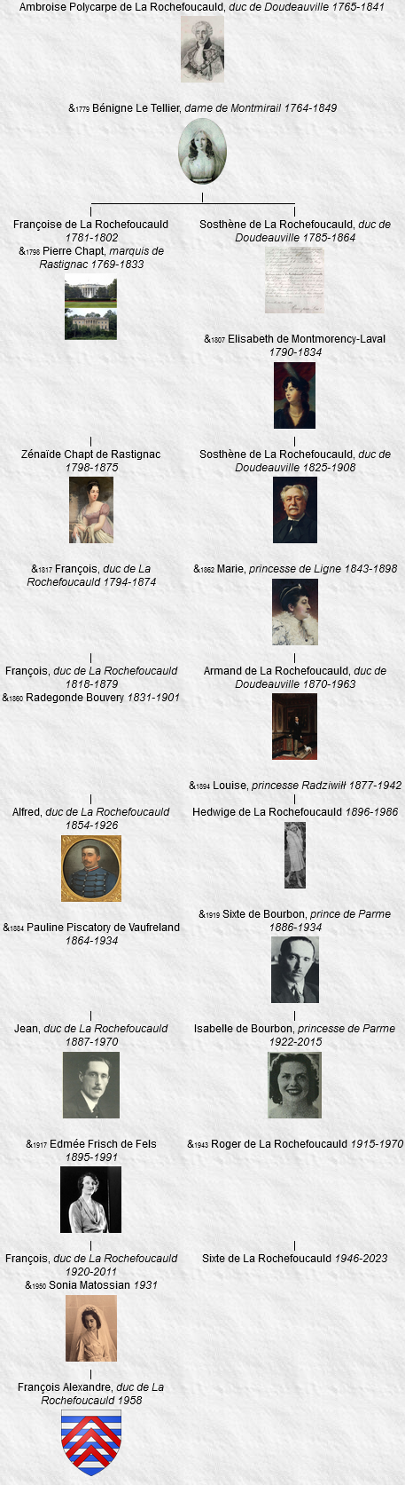 8Alexandre de La Rochefoucauld, duc d’Estissac (5e, 6 novembre 1889 – 11 novembre 1930), comte de La Rochefoucauld (4e, 6 novembre 1889 – 11 novembre 1930), né le 20 mars 1854, Paris, décédé le 11 novembre 1930, Combreux (Loiret) (à l’âge de 76 ans), propriétaire.