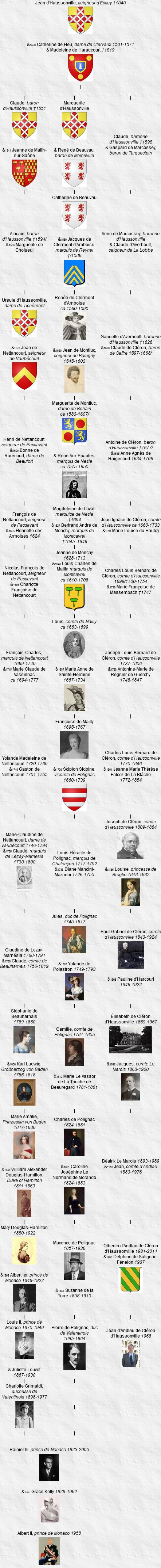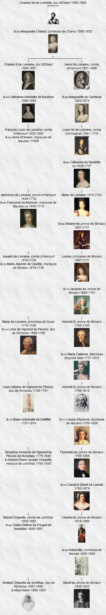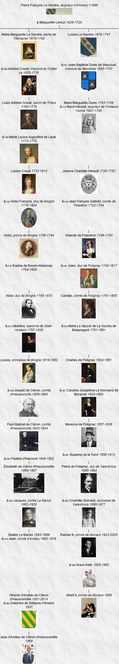 32Jacques Ier, prince de Monaco (5e , 29 décembre 1731 – 7 novembre 1733), duc de Valentinois et d’Estouteville, comte de Thorigny et de Matignon, baron de La Luthumière et de Saint-Lô, seigneur de Hambye, né le 21 novembre 1689, Torigni-sur-Vire (Manche), décédé le 23 avril 1751, Paris (à l’âge de 61 ans), gouverneur des villes et châteaux de Cherbourg, Granville, Saint-Lô, et de l’île Chausé.