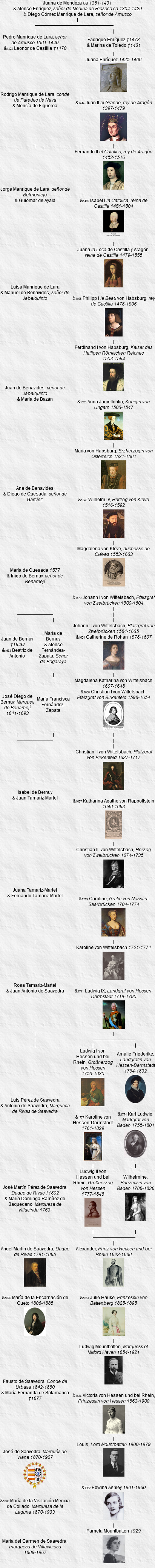 5 Victoria Eugenia Fernández de Córdova, Duquesa de Medinaceli (18e), Duquesa de Segorbe (19e), Duquesa de Alcalá de los Gazules (16e), Duquesa de Feria (17e), Duquesa de Camiña (12e), Duquesa de Santisteban del Puerto (8e), Duquesa de Ciudad Real (13e), Duquesa de Denia et de Tarifa (4e), née le 16 avril 1917, Madrid, décédée le 18 août 2013, Sevilla (Espana), inhumée le 19 août 2013, crypte de l’hôpital San Juan Bautista, Tolède (Espagne) (à l’âge de 96 ans).