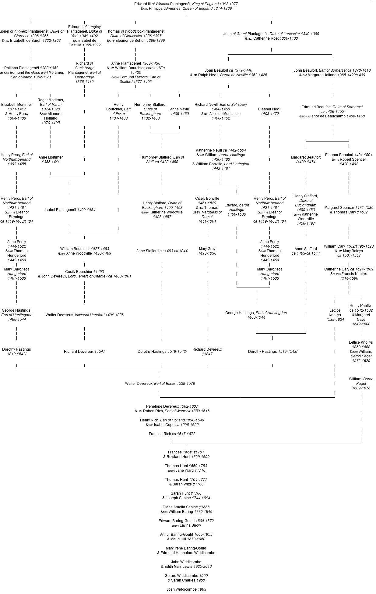 18 John Beaufort, Earl of Somerset (3e), Duke of Somerset (1er, 1443), Earl of Kendal (1er, 1443), né avant 25 mars 1404, décédé le 27 mai 1444.