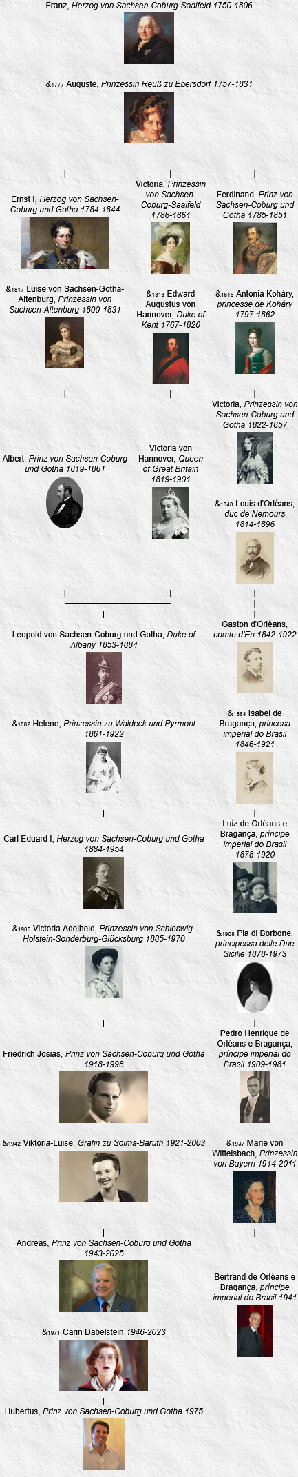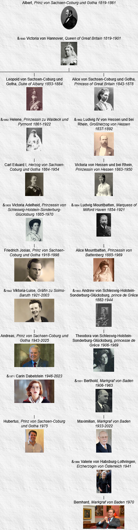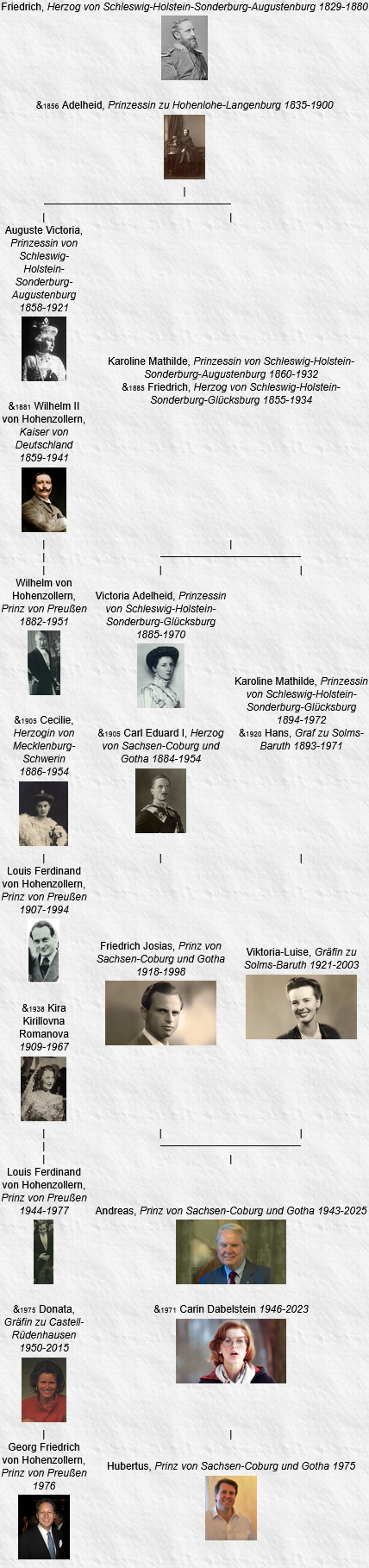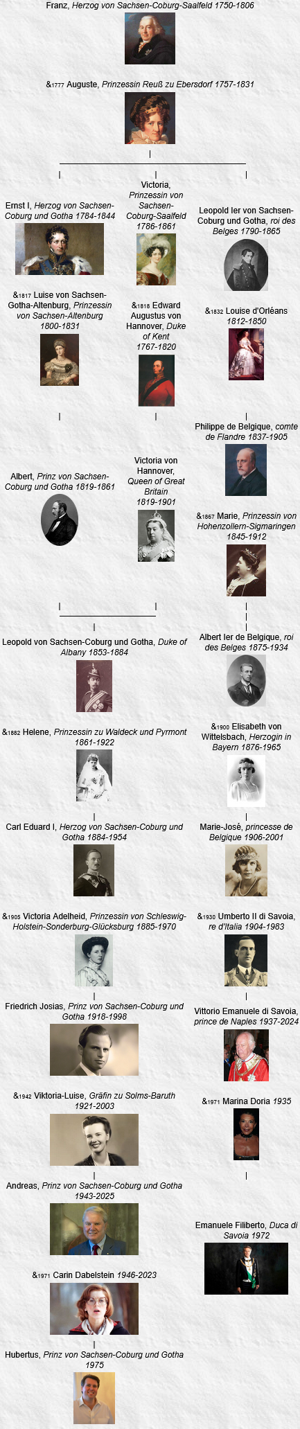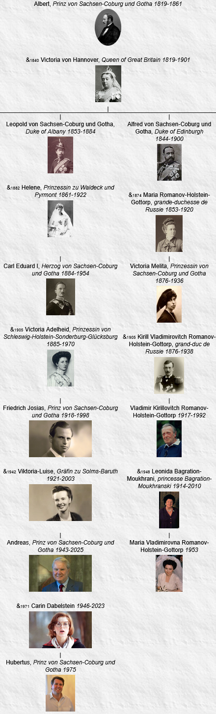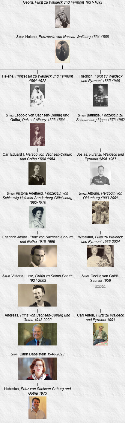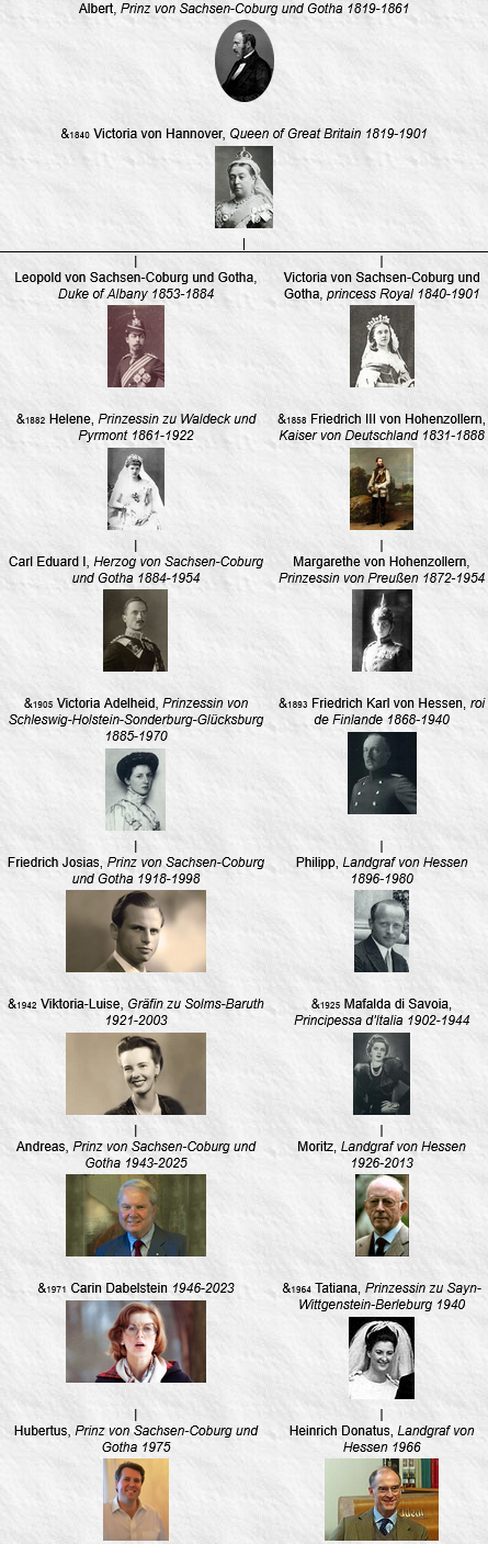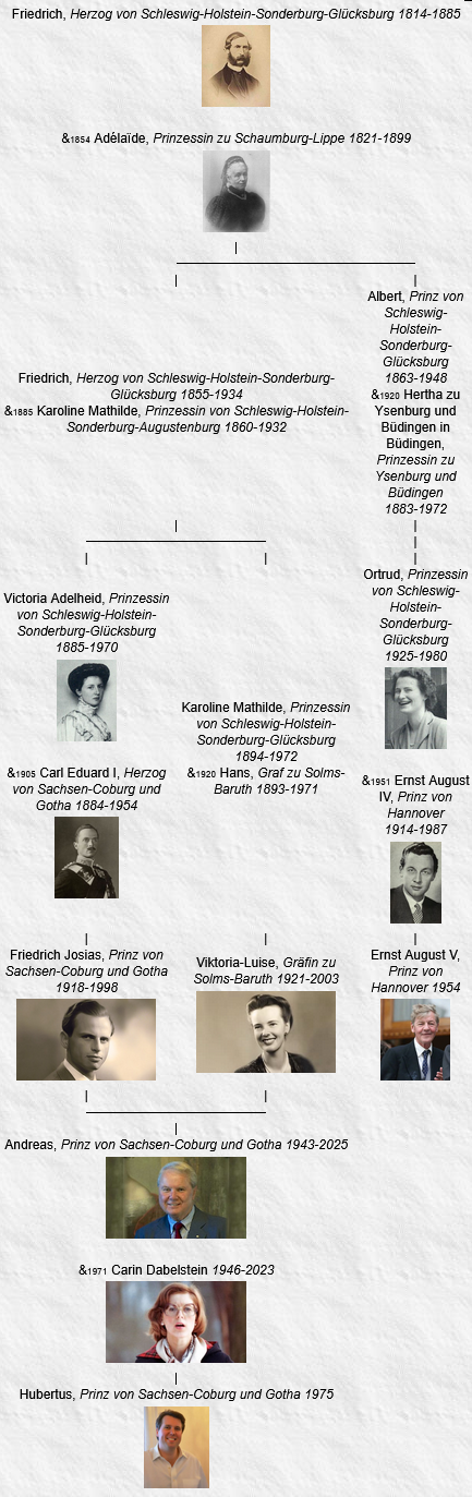 2 Andreas, Prinz von Sachsen-Coburg und Gotha, Herzog zu Sachsen, né le 21 mars 1943, Schloss Casel in der Niederlausitz, décédé le 3 avril 2025, Coburg, Bayern (Deutschland) (à l’âge de 82 ans).