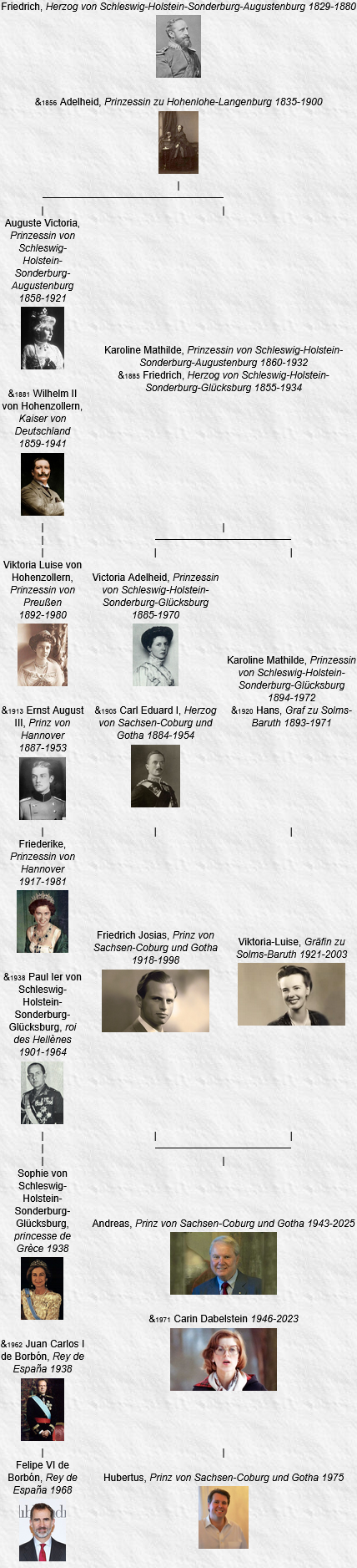 38 Friedrich, Herzog von Schleswig-Holstein-Sonderburg-Augustenburg, né le 6 juillet 1829, Augustenburg, décédé le 14 avril 1880, Wiesbaden (à l’âge de 50 ans).