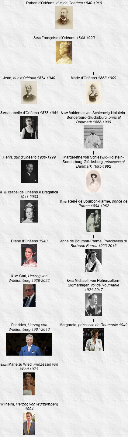 41 Françoise d’Orléans, née le 14 août 1844, Neuilly-sur-Seine (Hauts-de-Seine), baptisée le 14 août 1844, Neuilly-sur-Seine (Hauts-de-Seine), décédée le 28 octobre 1925, château de St. Firmin, inhumée, chapelle royale Saint Louis, Dreux (Eure-et-Loir) (à l’âge de 81 ans).