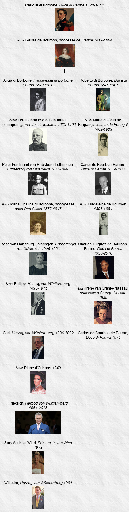 37 Alicia, Principessa di Borbone Parma, née le 27 décembre 1849, Parme (Italie), décédée le 16 janvier 1935, Schwertberg (Autriche) (à l’âge de 85 ans).