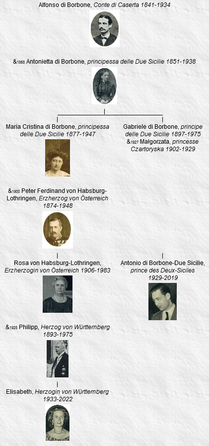 Marie-Thérèse, née le 31 juillet 1816, Vienne, décédée le 5 août 1867, Albano, inhumée, basilique Santa Chiara de Naples (à l’âge de 51 ans). Voir 23.